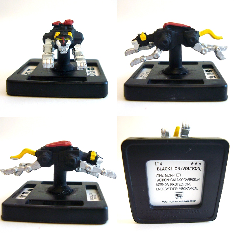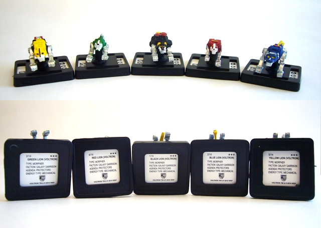 The Voltron set is unique in the Monsterpocalypse line and as such has a brand new packaging theme. It comes in a sturdy cardboard box completely decorated in a Voltron scheme. The front and side panels have a background star field with large art of either Voltron or one of the lions. The front panel is surrounded by a border representing the five lion colors, and inside that is a huge Voltron logo and smaller ones for Privateer Press, Monsterpocalypse, and WEP.
