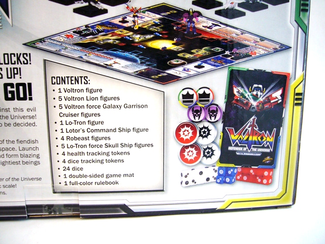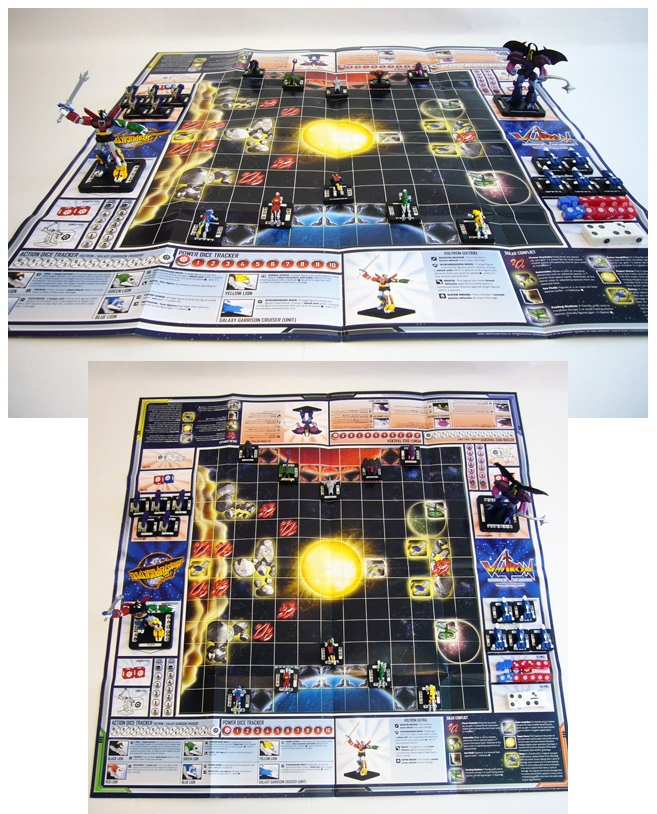 The Voltron set has everything two people need to play the game, with full armies on both sides. The included game map is double-sided, each with a different scenario consisting of a space battle with obstacles and special terrain features. Unlike some other miniature games, in Voltron everything happens on the board. There are graphical tracks representing health and other changing values (with included chits for you to keep track of where you are). Clearly defined boxes around the sides hold your spare units as well as the different dice, making things very easy and transparent.