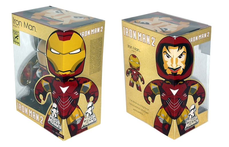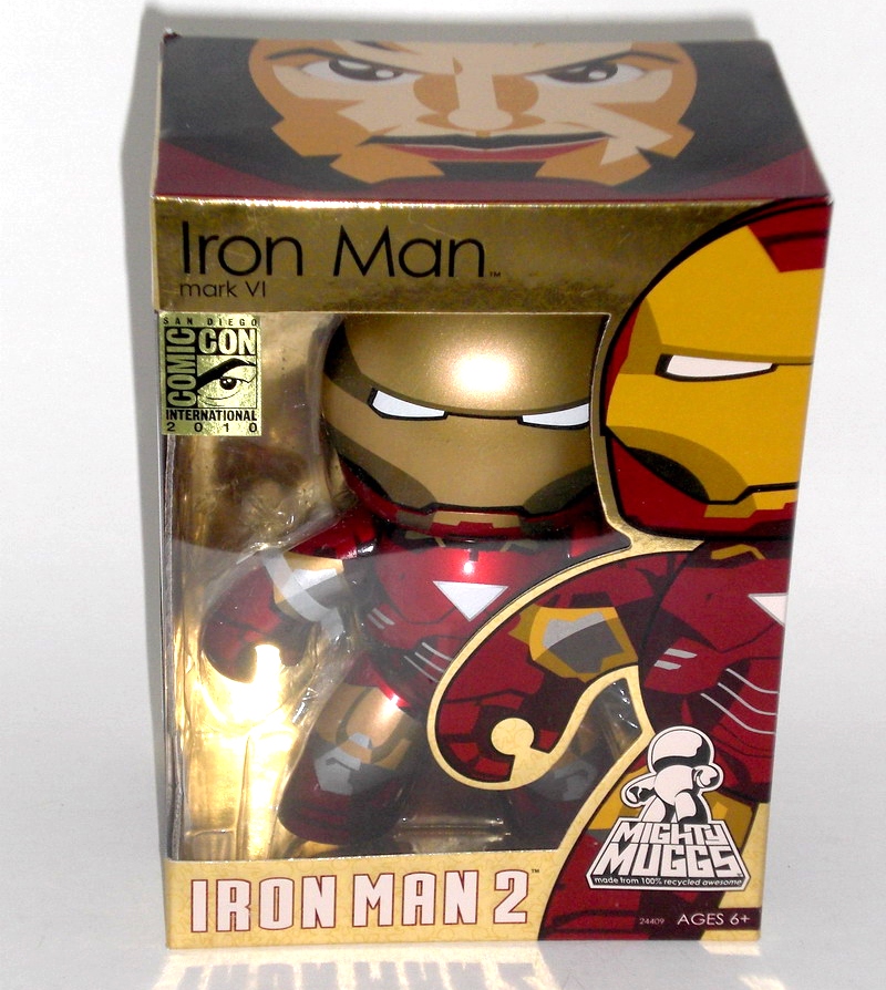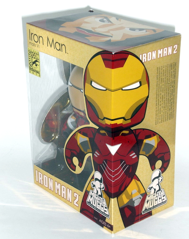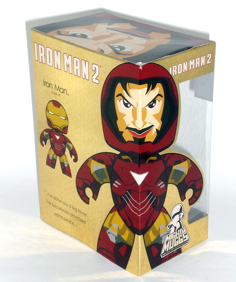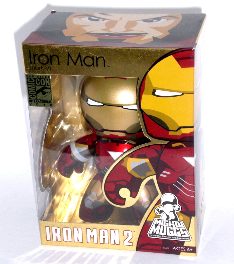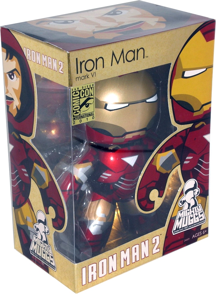 [HR][/HR]Hasbro has long been a member of the urban vinyl movement with their popular Mighty Muggs series. Incorporating characters from Transformers, GI Joe, Star Wars and Marvel, the line appeals to collectors who enjoy a little whimsy with their licensed heroes and villains. At this year's Comic-Con, Hasbro continued to deliver the Mighty Mugg fun with an exclusive Marvel figure: a Mark VI Mighty Mugg produced in celebration of this year's theatrical release of Iron Man 2.