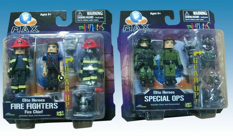 The first wave arriving in stores soon will consist of Firefighters, Smoke Jumpers, Law Enforcement and Special Ops. Pictured are the figures with their accessories packaged as they near production. Select scaled vehicles that can be used with this assortment, including the Minimate M.A.X. Tech Stealth Jet, can be found in Toys"R"Us now.