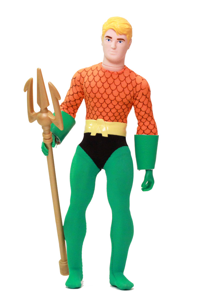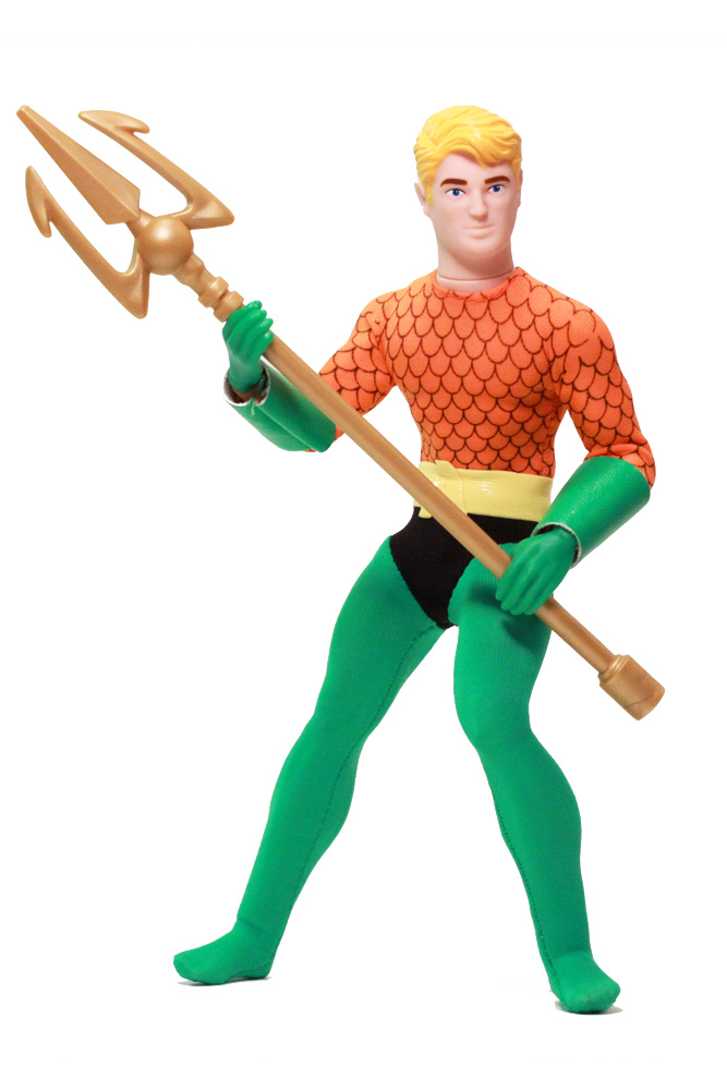 The fabric outfits of these figures are reminiscent of the old style but executed in a less humorous way than the vintage inspirations. Aquaman has molded hands rather than the over-sized oven mits. Both outfits have snaps in the back to keep them in place.