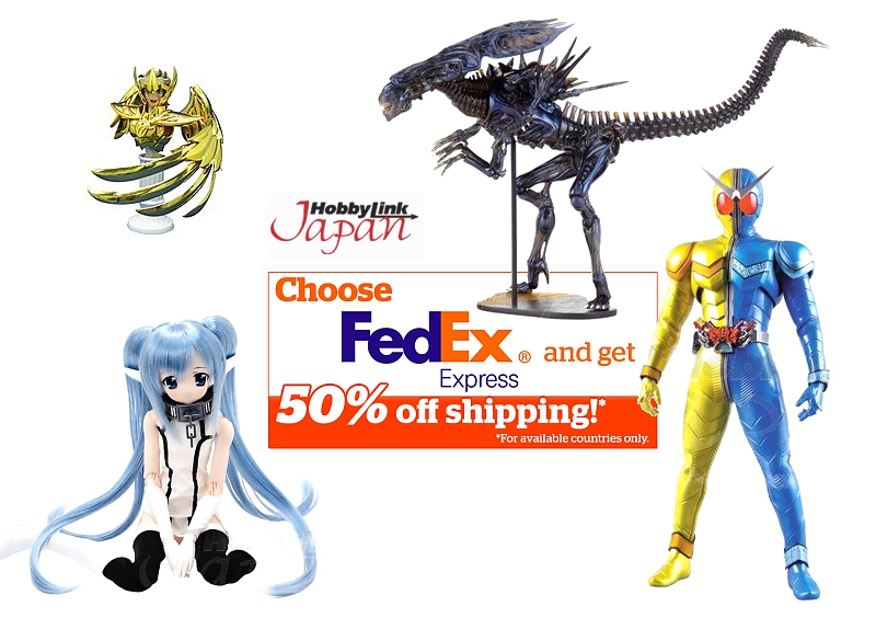HobbyLinkJapan.com is offering the amazing quality, speed, and security of FedEx at half the cost! That's right; choose FedEx as your shipping method between 6pm October 4 and 6pm October 15, 2010 (Japan Standard Time; GMT+9) and get 50% off of their normal FedEx international express shipping rates! CLICK HERE for full details.