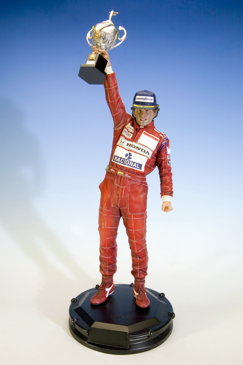 Appearing as he did after winning the Brazil GP 1991, Senna stands triumphant with his right hand holding his trophy up in the air. Sculpted by Koei Matsumoto and Shinya Akao, the Senna Fine Art Statue has been officially approved by the driver's sister Viviane Senna. Senna stands 13 inches tall, and his special base is decorated with the Senna Foundation's 50th Anniversary logo and serial number. The logo is also prominently displayed on the anniversary packaging.