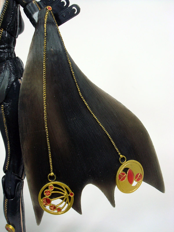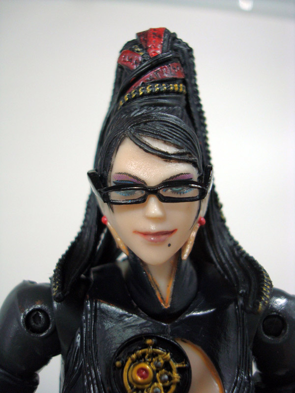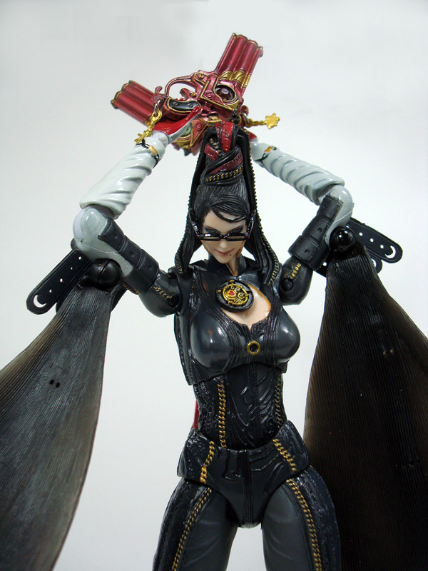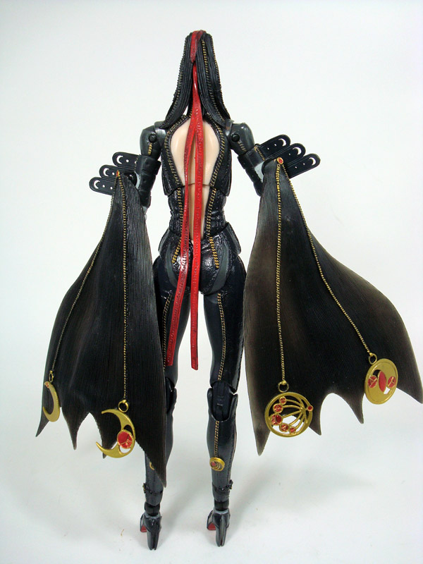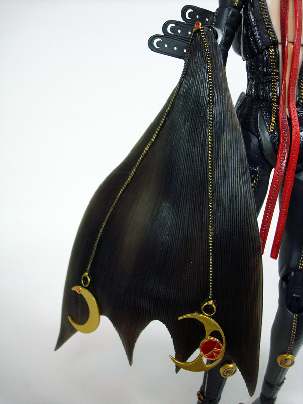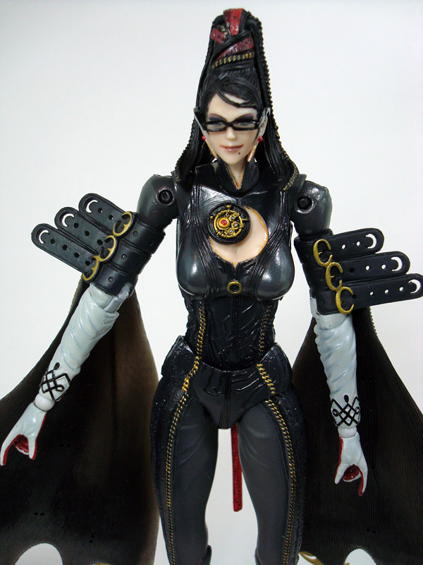 Bayonetta clothes are apparently made from her hair and it shows by the lined and textured surface of her one-piece, corseted outfit. She has what appear to be zippers running down her arms, from her breasts to her ankles, and from her neck and down her legs on her back. Her back is open, while her front is mostly closed except for a crescent shaped opening over her breasts. The moon symbol is used throughout the figure on the ends of the zippers, and her various medallions. All of these small features are perfectly sculpted and offer a lot of detail to enhance the look of the figure She also has long, cape like extensions coming from her arms that are not only articulated, but are bendable for posing. Her face is done perfectly, with a small trademark smirk and glasses that don’t overtake her face.