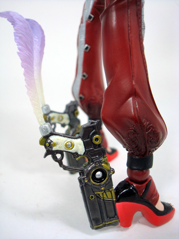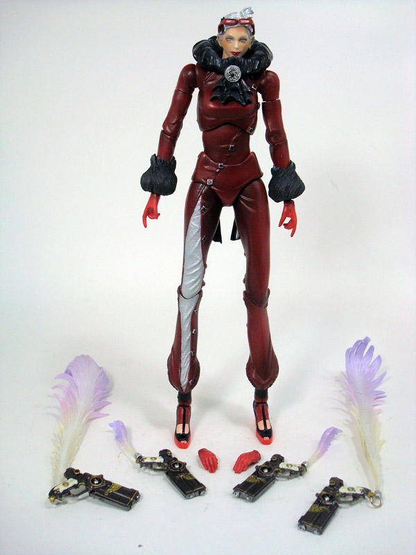 Both Bayonetta and Jeanne come with the same amount of accessories and each with a second set of hands. Bayonetta’s four guns, known as Scarbourough Fair, feature two barrels and intricately sculpted details including a different colored jewel and keychain symbol on each one, representing the four herbs Parsley, Thyme, Rosemary, and Sage. Two guns are wielded in her hands, while the other two slide into grooves on her ankles. One issue I came across is that the “foot” guns don’t want to stay in their holders and fall right out with any sort of posing. Jeanne has similar weapons, known as All4One, that are a little more sleek and classy looking than Bayonetta’s. The biggest noticeable difference with Jeanne’s guns are the long feathers that hang from the butts. The handheld guns’ feathers attach via metal rings that allow for full movement and the feathers themselves are bendable for enhanced poseability.