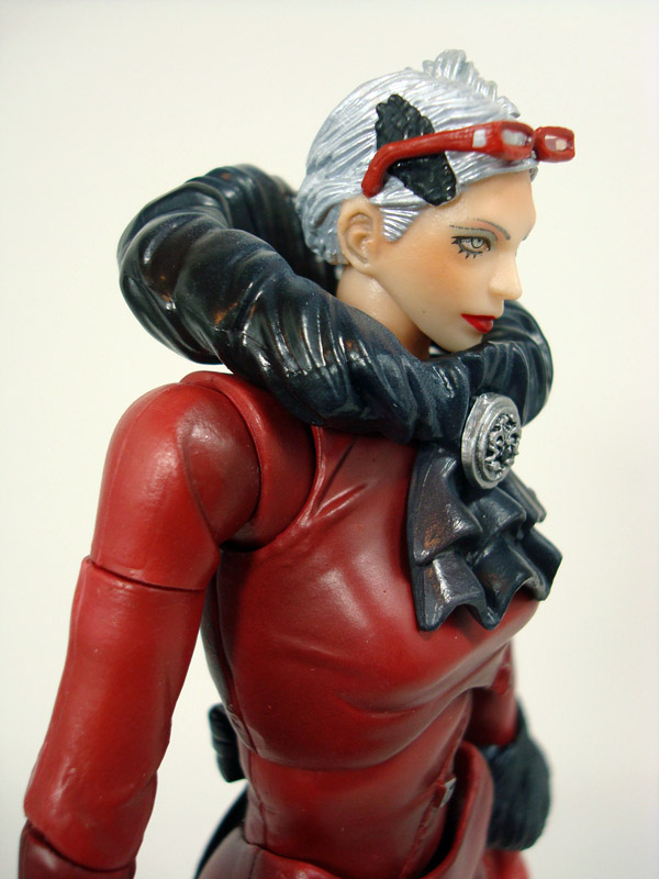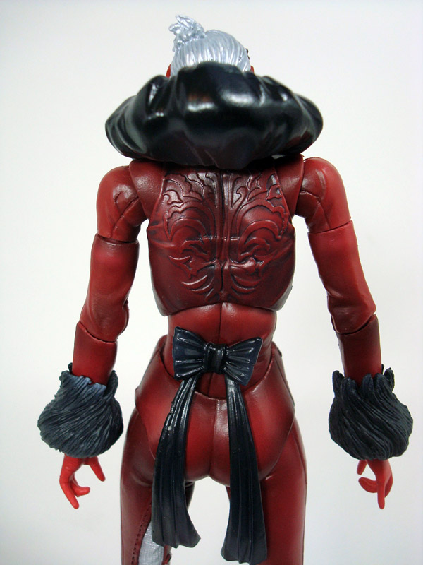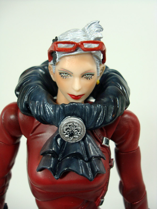Jeanne, like Bayonetta, features a unique outfit with a fantastic amount if detail that really sets her apart. Her jumpsuit seems a little more bulky than B.’s, and features snaps instead of the zippers of the other woman. Her snaps run from her chest and down her leg in the front and from her behind down her leg in the rear. The snaps are opened on her legs to reveal and mesh texture on both sides. Jeanne features sculpted fur on her wrists and around her neck and a long bow on her lower back. A tree-like design is sculpted as a relief on the back of her outfit and looks similar to the design on the medallion at her neck. Like Bayonetta, Jeanne has glasses, but hers are propped on her head, contrasting her short, slicked back hairstyle.