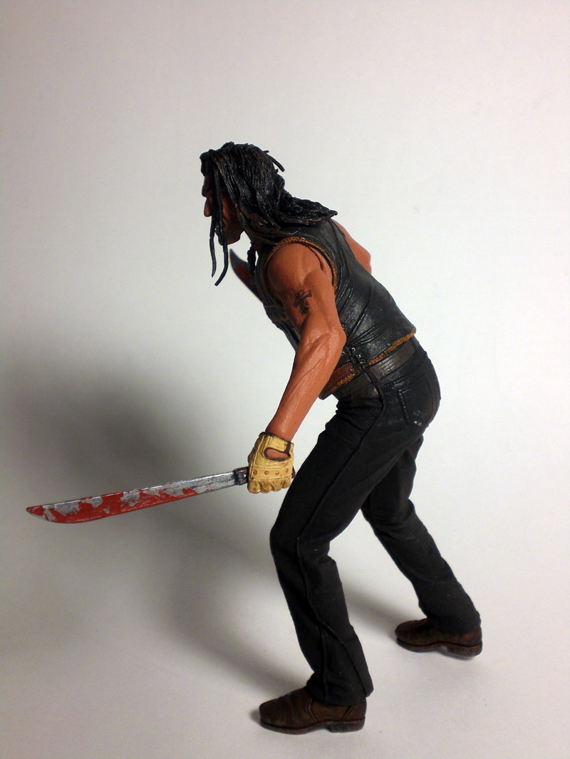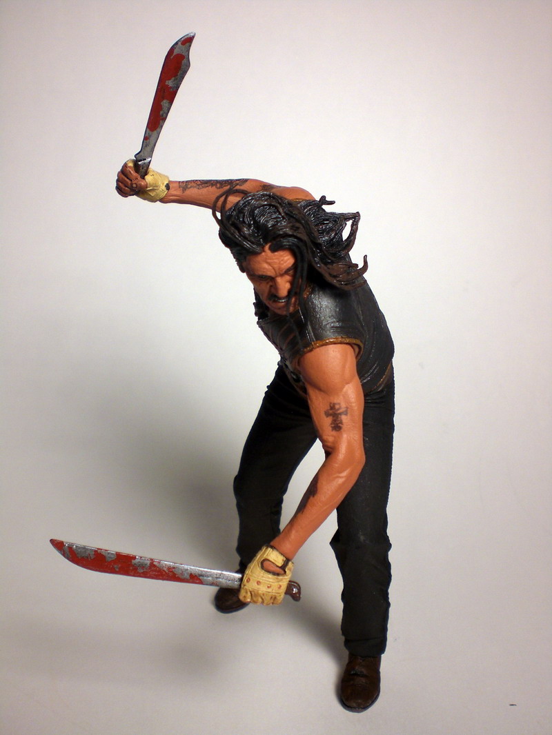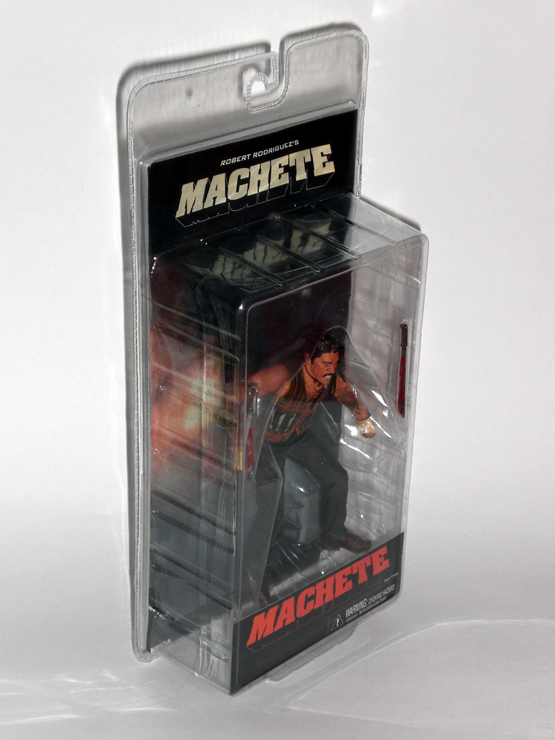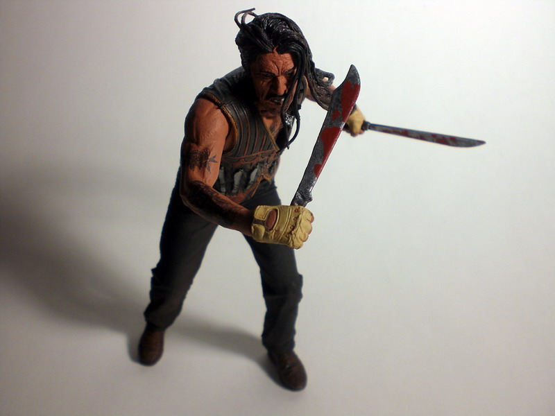 ARTICULATION: While NECA has created several extensively articulated action figures in the past couple of years, Machete is quite the departure from that. It seems that this figure was originally intended for release in conjunction with the Grindhouse DVD release but was held back for the feature film instead. Perhaps this is why the figure features such minimal articulated joints. The figure tends to focus more on the sculpt and less on the posing options. While the articulated joints on this figure are minimal, it still offers a few poseable alternatives.