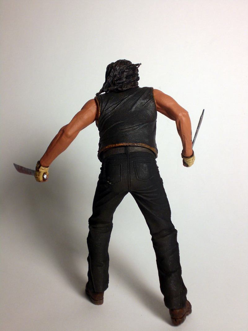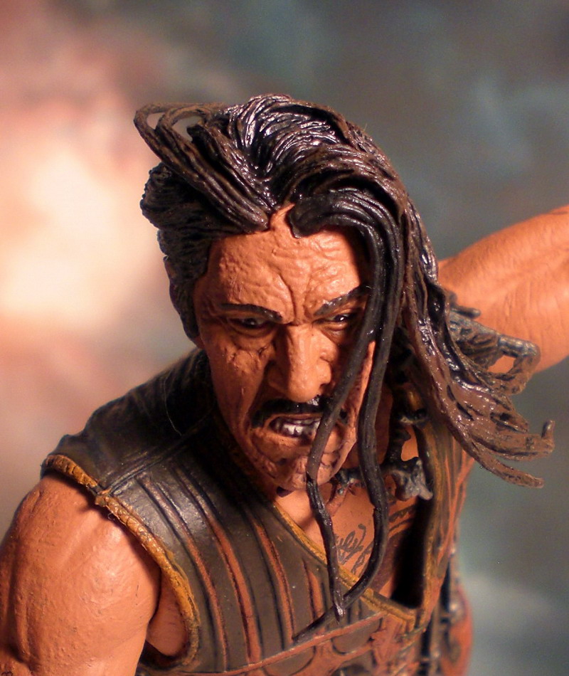 SCULPT/ACCESORIES: NECA has done a fantastic job at capturing the likeness of actor Danny Trejo in his portrayal of the deadly Machete. The facial sculpt although great, looks better from certain angles than others. Machete is captured in a ruthless blade-wielding pose with his long black hair waving wildly in the wind. The detail of Machete’s knife-toting leather vest is truly amazing and at first glance looks as if the sculpted knives are removable but unfortunately they are not. Machete also includes two machete blades of varying lengths which can be easily placed in the figure’s hands.
