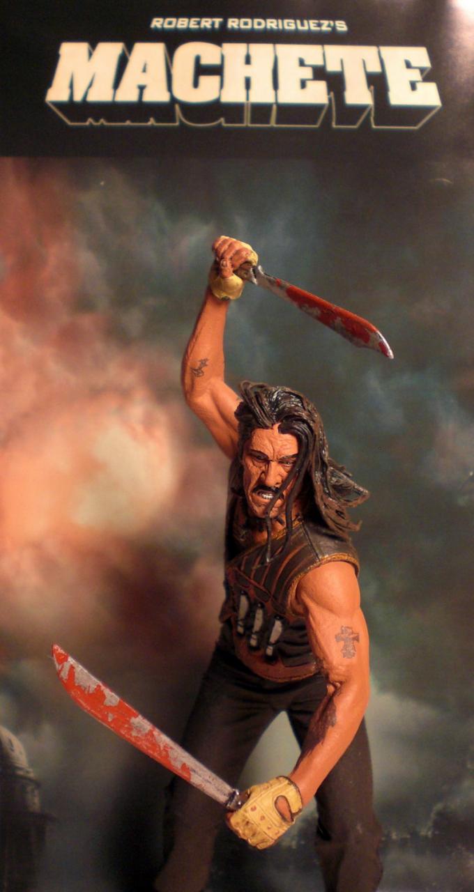Ever since the Machete mock trailer was played during the intermission portion of the Grindhouse films in 2007, audiences have been eagerly awaiting a feature-length film of the cold-blooded Mexican anti-hero played by Danny Trejo. Three years later director Robert Rodriguez has fulfilled fans wishes with the recent theatrical release of the action-packed Mexploitation film and now fans can own their very own action figure of the blade-wielding Machete courtesy of NECA.