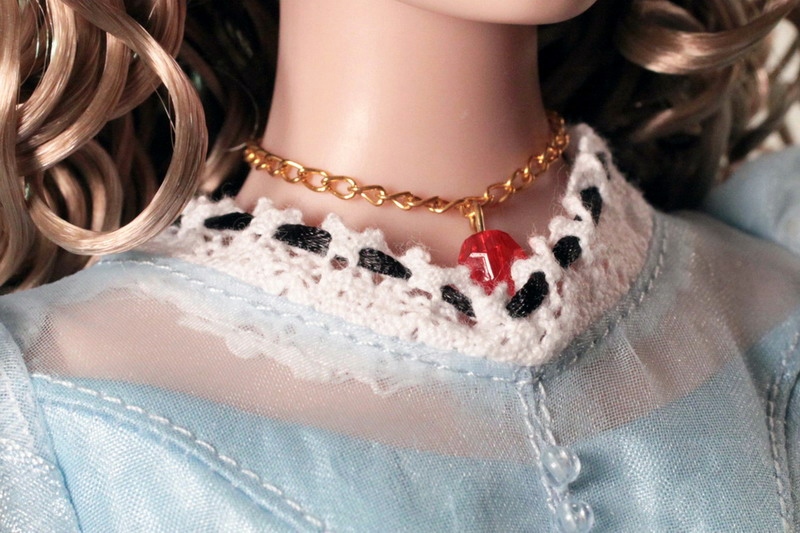 There are quite a few accessories for Alice who comes with striped mesh fingerless gloves, striped knit tights, soft cotton petticoat, black and white faux leather boots, and gold chain necklace with red jewel.