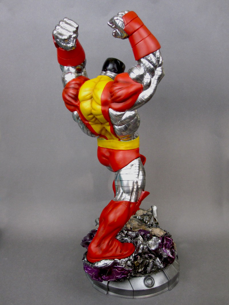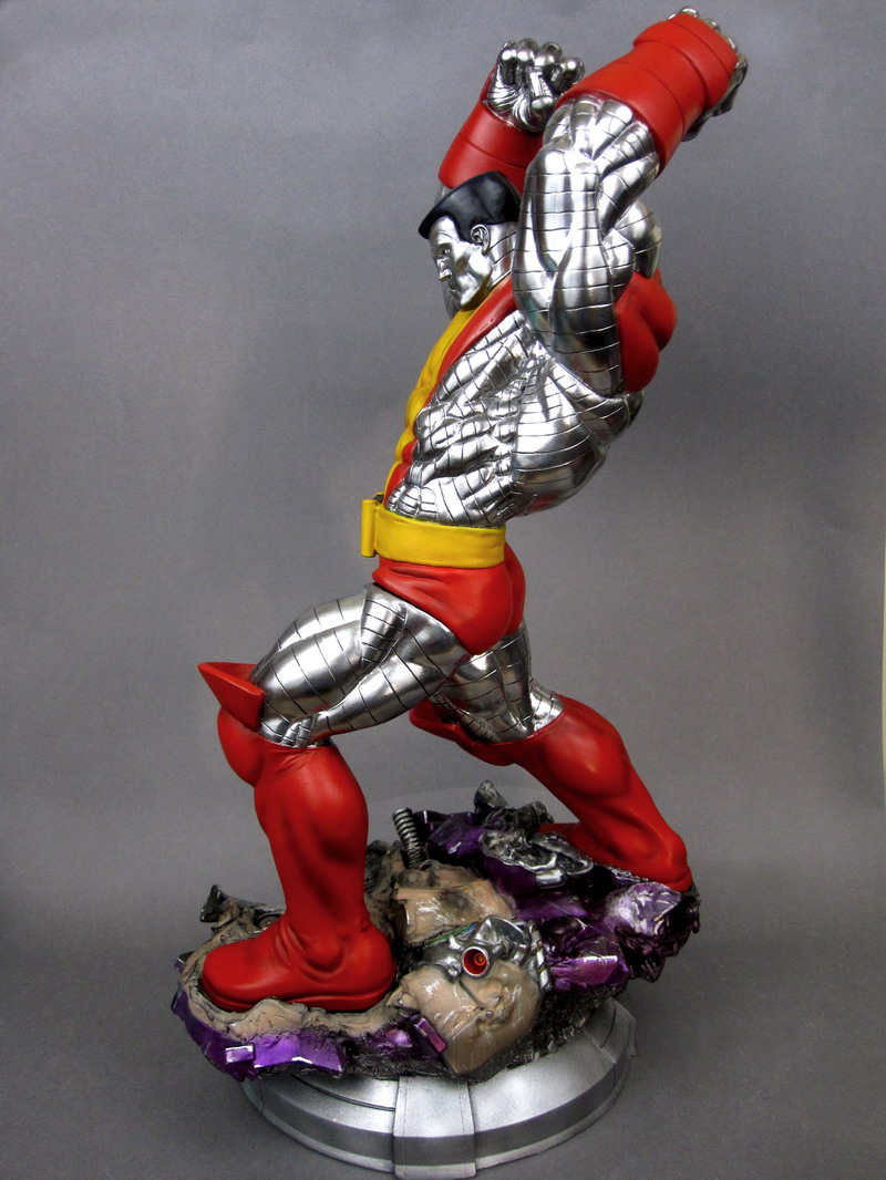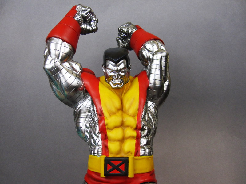 Inspired by Jim Lee's 1990's era X-Men, Colossus is an unstoppable force of steel skin and muscle. The massive mutant is posed triumphant on the field of battle, about to bring down his heavy fists to crush the last of his wrecked foes. He wears his classic bright red and yellow costume that's decorated at the waist with a large red and black "X" logo. Everywhere his "skin" is exposed is bright metallic silver, except for his black hair, making Colossus very visually dynamic. Collectors also have two options when it comes to displaying the X-Man as he comes with two interchangeable heads: the first is angry yet focused, while the second is a sheer mask of rage.