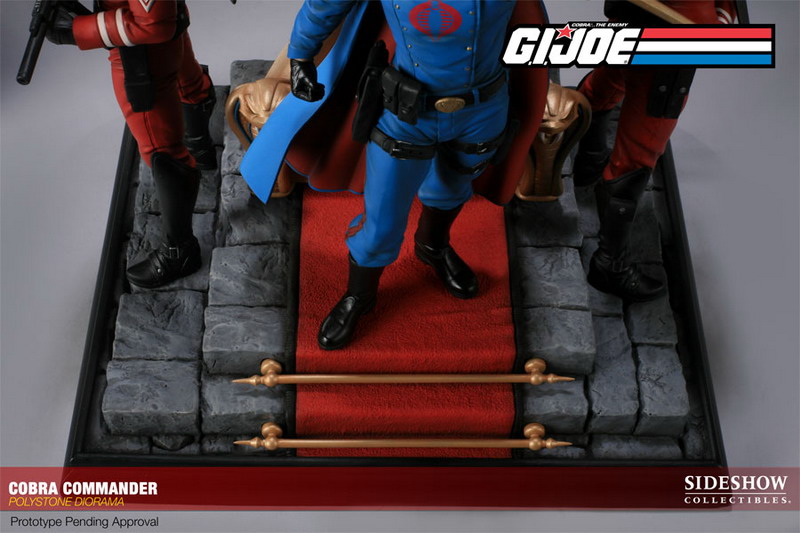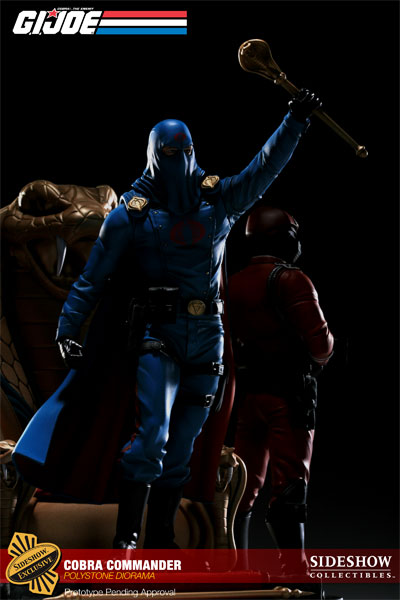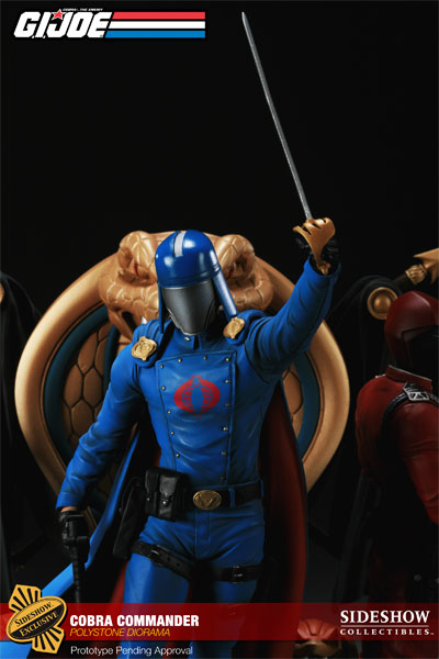 An exclusive version of the Cobra Commander Diorama, which includes two additional switch-out heads; one helmeted and one hooded, switch-out left hand holding a sword, and switch-out right hand holding a pistol for Cobra Commander, will be priced at $299.99 with an Edition Size of 200 pieces worldwide. Additionally, a Regular Edition, without the additional switch-out accessories, will be available for Pre-Order and priced at $299.99.