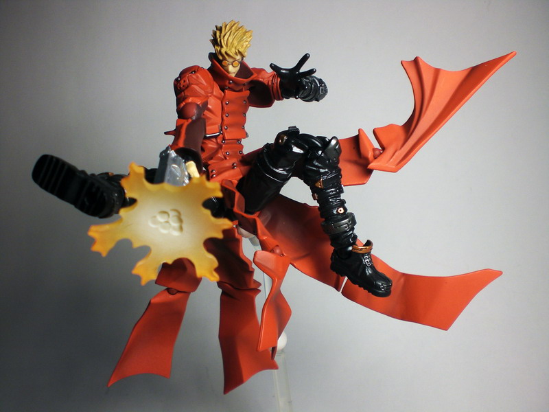 Vash has three different faces which can be switched out by removing the frontal half of the head piece. Vash even includes a removable blast effect that can be placed in the barrel of his pistols and even a plastic square container to store all of the figure's parts inside.