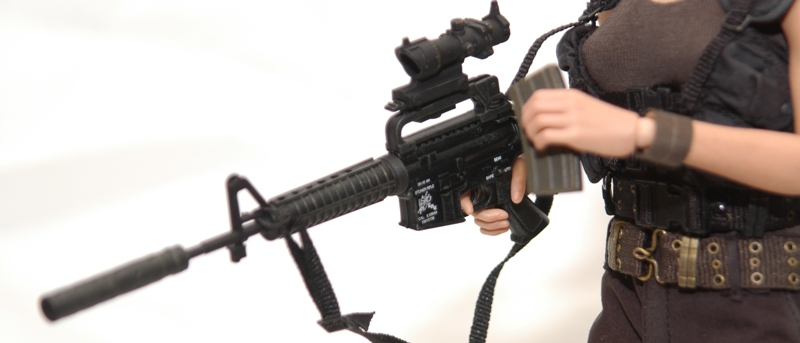As previously mentioned, Sarah comes loaded for bear with plenty of weaponry, including a SR-16 M4 Stoner (Colt Commando CAR-15) with detachable sound suppressor, laser sight and ACOG scope; a Remington 870 Police Combat Shotgun with folding stock, high capacity tube magazine and speed reloader; a Custom Colt/Detonics 1911 .45 pistol, and a combat knife with black leather sheath (above).