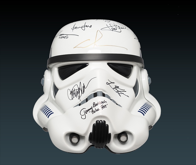 The helmet features signatures from Star Wars creator George Lucas; actors Mark Hamill, Harrison Ford, Carrie Fisher, David Prowse, James Earl Jones, Frank Oz, Peter Mayhew, Anthony Daniels, Kenny Baker, Billy Dee Williams, Jeremy Bulloch and Warwick Davis; Star Wars: Episode IV: A New Hope and Episode V The Empire Strikes Back producer Gary Kurtz, director, the late Irvin Kershner (The Empire Strikes Back); screenwriter Lawrence Kasdan (Empire and Return of the Jedi); and composer John Williams.