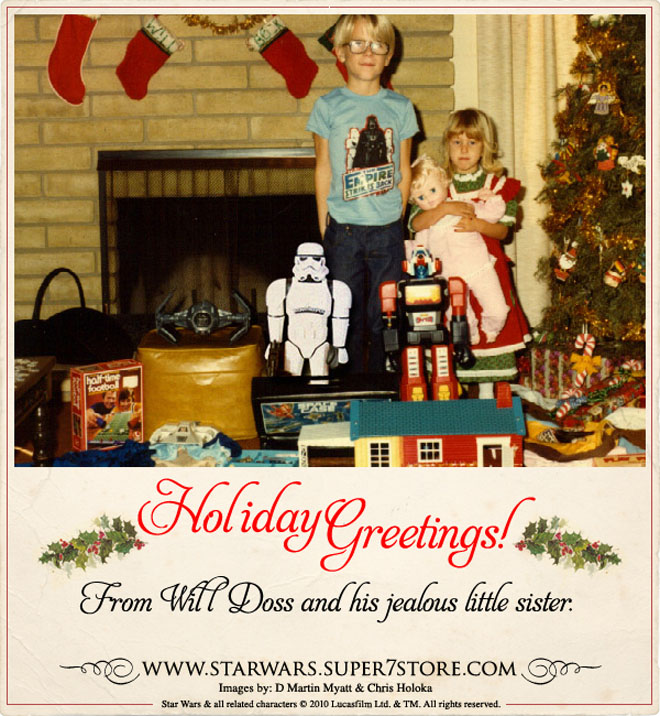 [HR][/HR]Wired magazine online has an exclusive look at some nifty nostalgic holiday postcards created by Super 7 for their Stormtrooper Super Shogun. For the retro postcards, photographer D. Martin Myatt, who also works at our affiliate site RebelScum.com, asked fans to donate actual ’70s and ’80s photos of themselves holding Star Wars toys. (The names used on the cards are the names of people in the pictures.) With a little Photoshop magic, the Stormtrooper Super Shogun became a part of the memories. Check them all out HERE.