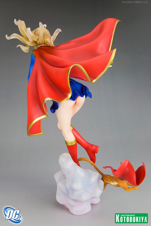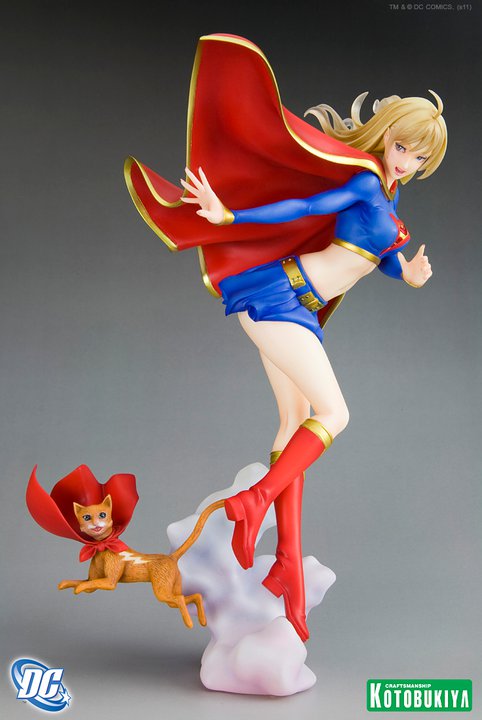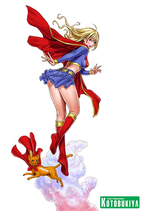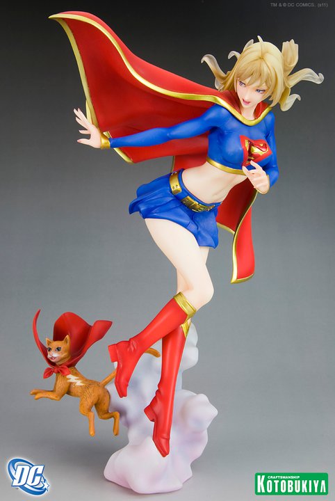 Based on the current "New Earth" version of the character and costume and inspired by Superman/Batman #8 "Supergirl from Krypton," Kara arrives on the scene in her super cute two piece blue, red, and gold outfit consisting of a very short skirt and midriff-baring top along with knee-length boots. Supergirl flies on top of a small cloud formation, twisting to look behind her. She's even joined by her faithful kitty companion Streaky the Supercat! Kara's beautiful flowing blonde hair is further accented by translucent material, and perfectly frames her adorable Bishoujo-styled smiling face.
