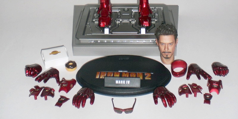 ACCESSORIES: The Mark IV MMS figure includes a plethora of packed in goodies that will significantly enhance the overall demand and value of the piece for collectors. Aside from its LED light-up eyes, ARC reactor and hands, the figure comes packed chock-full of awesome extras. Thanks to the fine folks at Hot Toys, collectors are able to recreate the popular hangover scene from the film minus the giant donut with their last-minute inclusion of a donut box with donut and the designer red shades that Tony wears in that scene. Aside from the standard display base with movie logo and name plaque, this figure also includes an awesome light-up base resembling the one seen in Tony’s hall of armors in the film. The base also features a clear Plexiglas tube and adjustable waist clip that allows for the figure to be displayed in various flight poses.