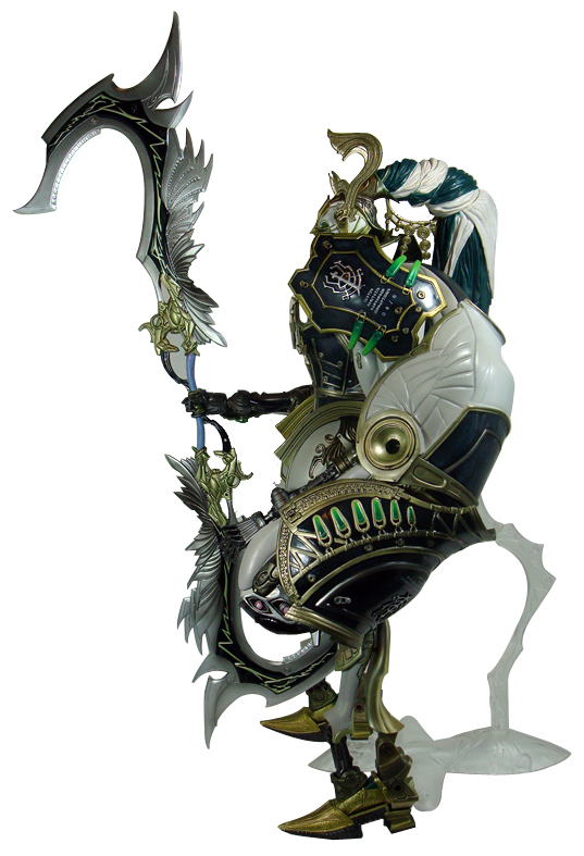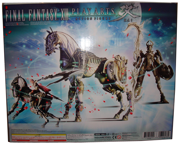 [HR][/HR]The powerful Odin summon has appeared in almost every Final Fantasy game released since Final Fantasy 3, and his appearance hasn’t changed much in all of that time, even if the method in calling him to battle has. But in the newest FF game, Final Fantasy 13, Odin is given a major overhaul as part of the new combat system, including a bold new look. Now referred to as an Eidolon, Odin must be defeated in battle before becoming the lead character Lightning’s exclusive summon. Odin first appears in a humanoid form wielding his massive double-ended Zantetsuken sword, which in older games was always the case, but he was also astride a mighty steed. The surprise comes when the player activates the Gestalt mode and a secondary form takes place as Odin himself transforms into a horse for Lightning to mount as she splits his sword into two massive scythe blades to use on enemies. The new Odin is now realized in a fully-transformable, highly-detailed action figure in Square-Enix’s FFXIII Play Arts Kai series.