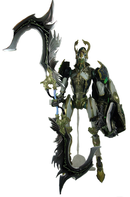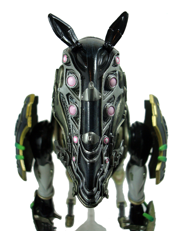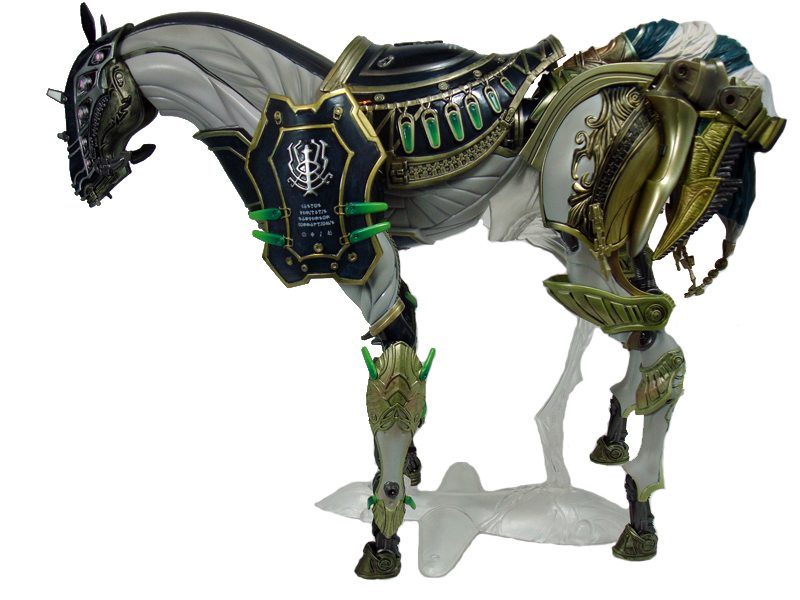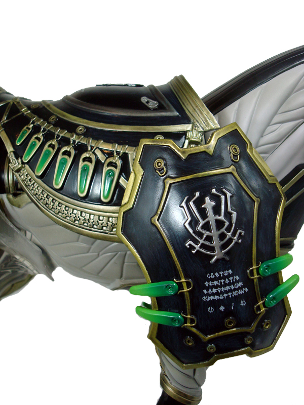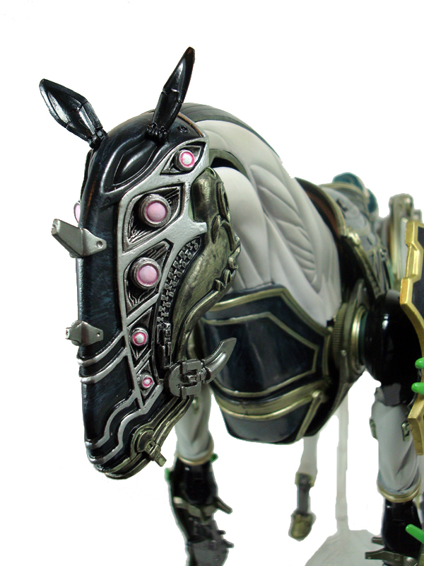 PACKAGING: Odin comes packaged in a massive box displaying the figure in Horse form through a large front window. The colorful box is mostly blues and greens with a design reminiscent of the game’s Crystarium menu. The sides and back of the packaging offer photos of the completed figure and his various display options. The figure itself is packaged extremely well with a three-layer stacked plastic tray with the bottom used for misc. parts and the top and middle layer fitting around the figure and zip-tied securely in place.