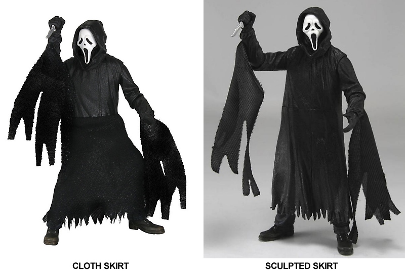 [HR][/HR]As reported last month (see our story HERE), NECA had bowed to fan demand and announced that they would be offering a running production change of their Scream Ghostface action figure. The new Ghostface figure features a sculpted robe as opposed to the soft goods skirt on the initial release, currently hitting retail now. The new sculpted robe Ghostface goes into production this March and will see release in May.