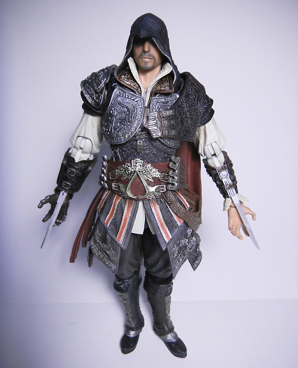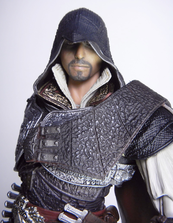 SCULPT: The level of rendered details on this figure is simply mind-blowing. Ezio's costume consists of various complex elements of armor and fabric which are flawlessly represented in three-dimensional form. The fabric components on Ezio's outfit feature a rich life-like cross-hatched texture that closely resembles the look and feel of real material. The highly complex outfit on Ezio is composed of several layers of extensively-detailed sculpted parts which allow the figure to retain its agility while not impacting the sculpted details that are crucial to the character. The figure measures close to 10" in height and is also pretty heavy which is a reflection of its quality and overall value. The head sculpt on the figure looks great and captures the essence and feel of the video game quite well.