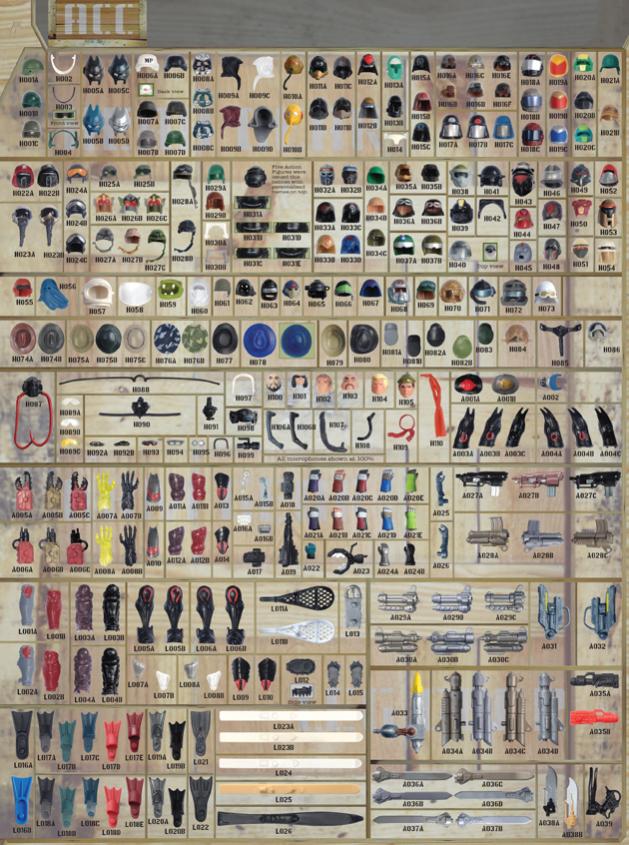 The R.A.H.C. Guide illustrates the era's 689 action figures, 135 vehicles and play sets and 1,349 accessories including all known variations. Not only is every accessory present and accounted for, they have each been assigned a unique number and identified throughout the resource guide. The accessories are then culminated in a separate section clearly displayed and organized by category. Each action figure has been carefully examined between its initial run and further re-releases to ensure that an accurate sample is clearly and concisely presented for the collector who is identifying individual action figures or sorting through unorganized lots.
