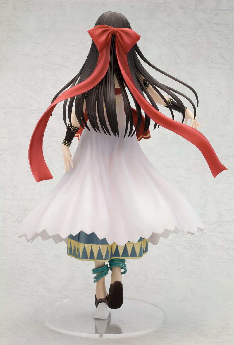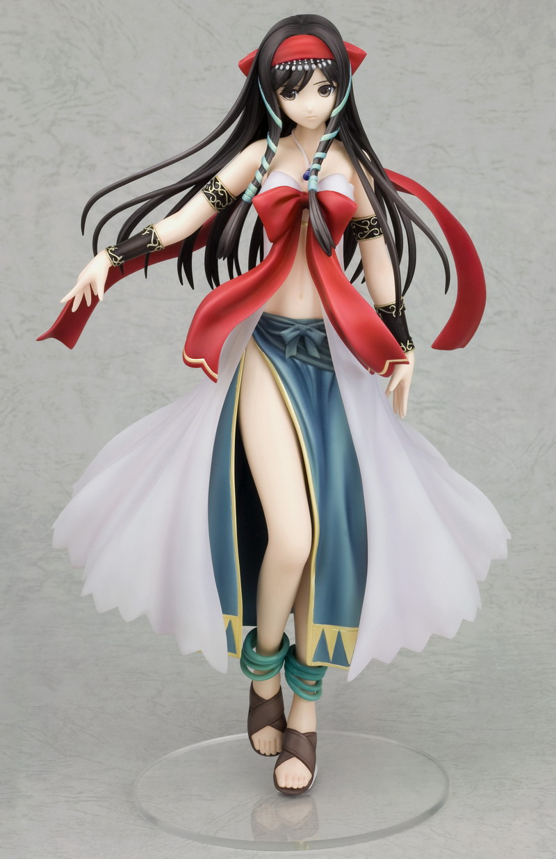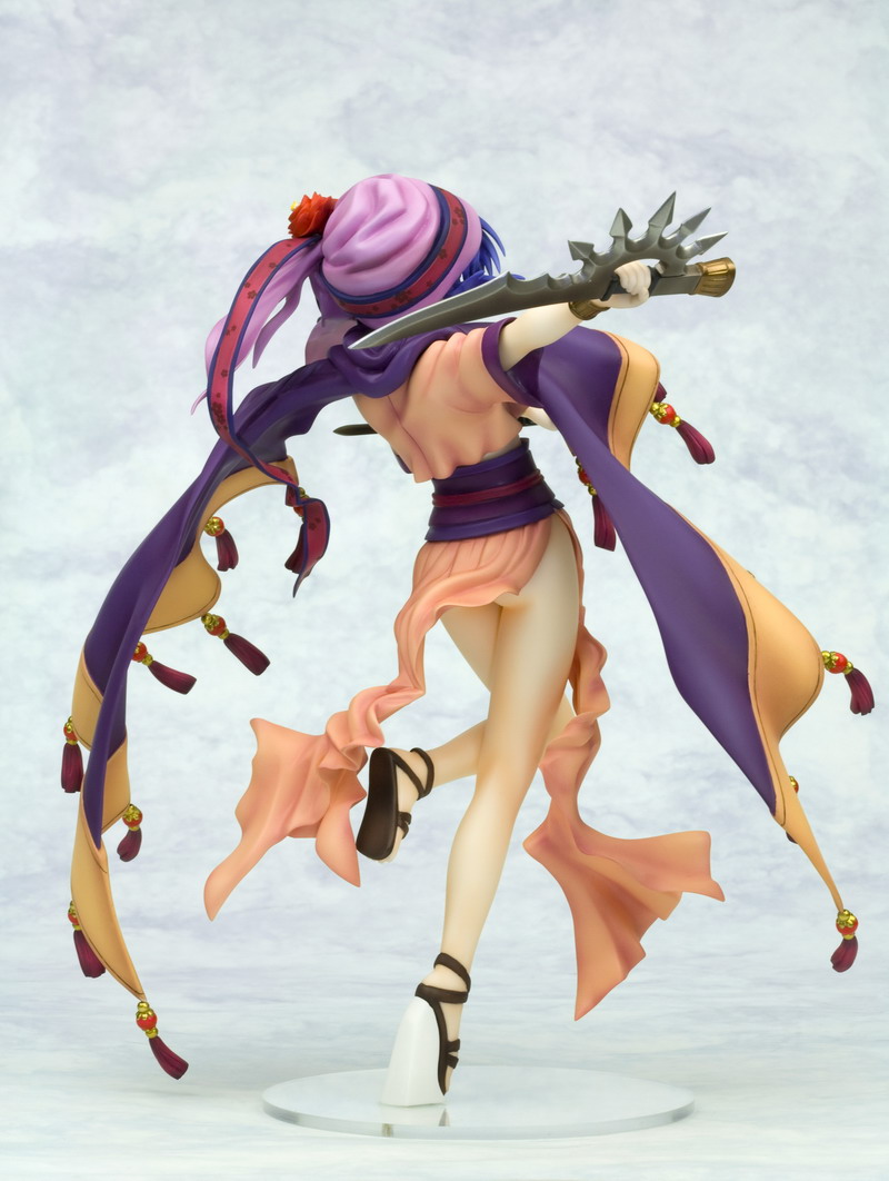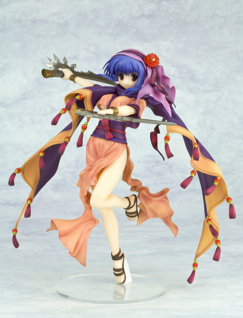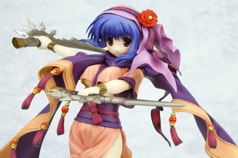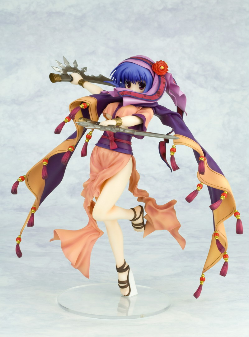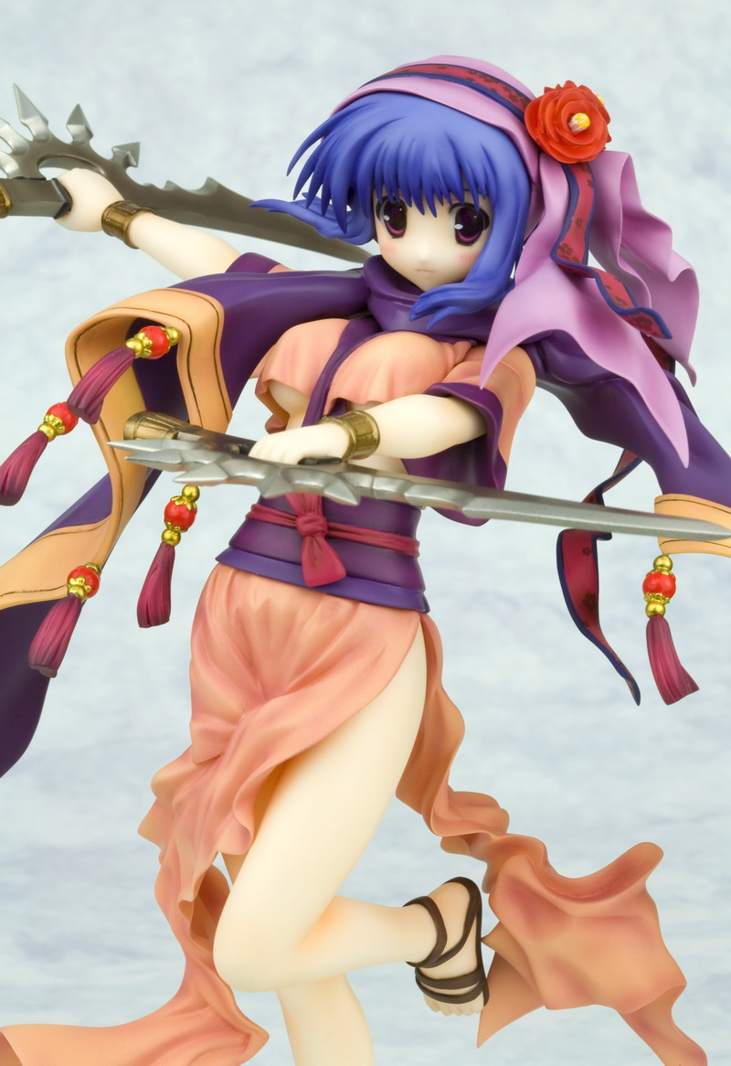 Like Silfa before her, Ilfa swaps out her boring work clothes for a fanciful and complex outfit, this time with a pink and purple dress that gives way to a long tan and purple cloak that swoops around the girl. All of her clothing is accented with little red, gold, and purple tassels that evoke a flowing movement in the statue. Ilfa stands balanced on one foot with the other bent behind her while swinging twin swords through the air. Her blue hair and pretty face are accented by a matching purple ribbon headpiece with ornamental flower hairpin; there's even a bonus part that hides her face behind a veil of mystery. Ilfa stands almost 8 inches tall (1/8th scale) and was sculpted by master artist "Justice."