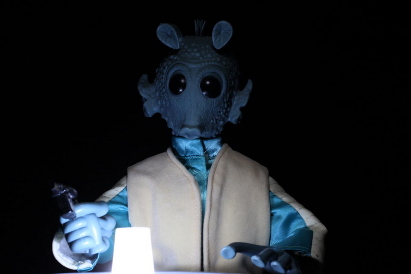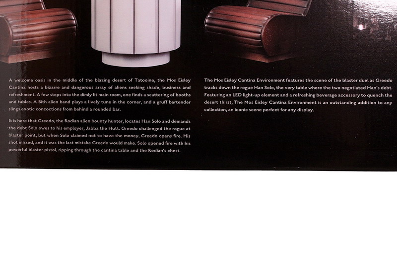 [HR][/HR]An object of much debate amongst Star Wars fans – is whether Greedo shot first. Actually, there is no debate amongst the fans but they tend to lean against the official Lucasfilm changes to the original Star Wars film where Bounty Hunter Greedo attempts to shoot Han but misses. In Sideshow Collectibles’ new MOS EISLEY CANTINA 12” Figure Environment, you can settle your own version of the movie once and for all. But if you read the background on the box, there’s no escaping that Greedo shot first.