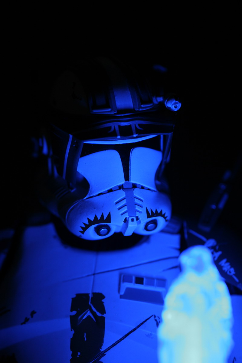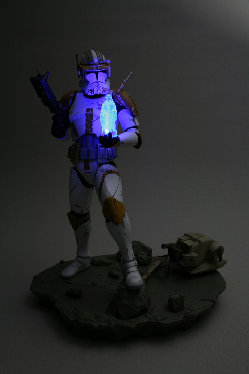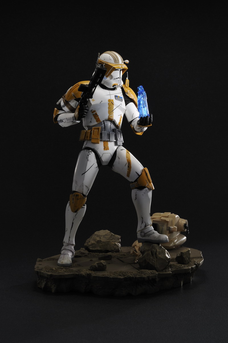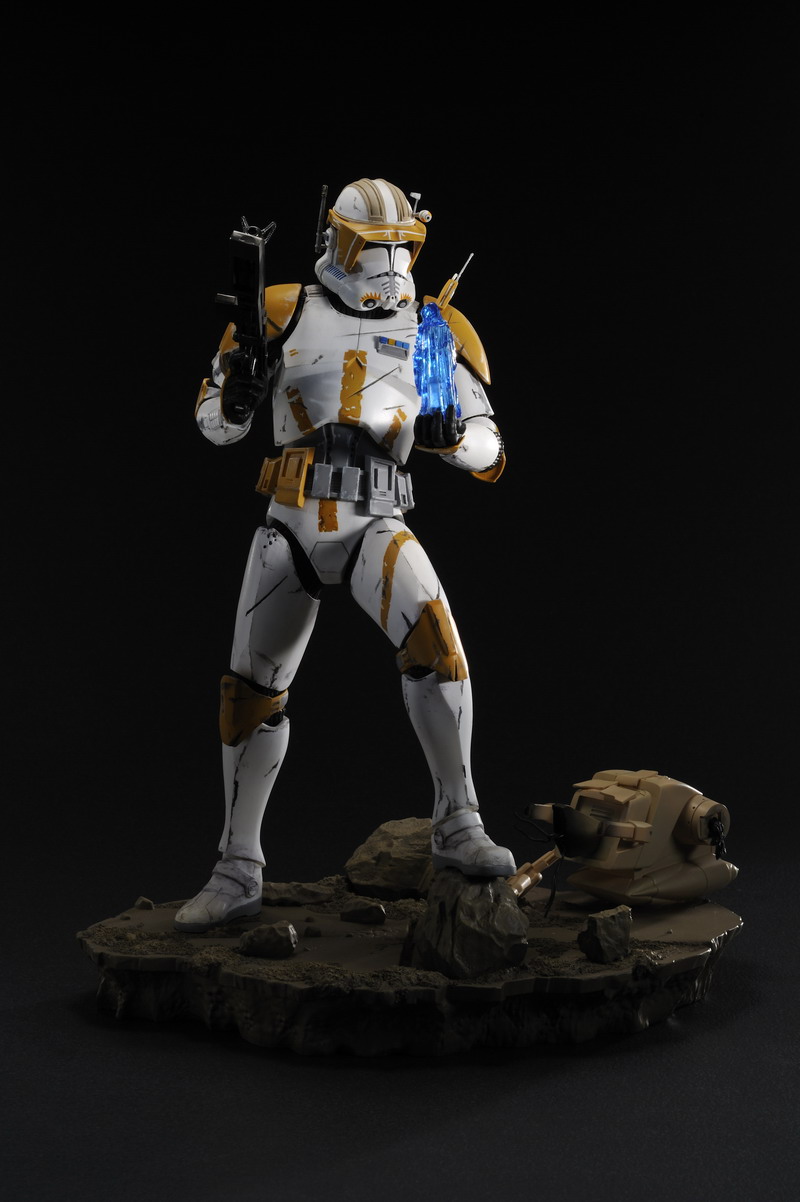 The recently resurrected line of Star Wars ARTFX Statues (bringing the heroes and villains of the Star Wars universe to life in dynamic 1/7th scale) continues with one of the most popular characters from the prequel films. A leader of clone troopers and friend to Obi-Wan Kenobi until Order 66, here comes Episode III: Revenge Of The Sith: COmmander Cody. Paying homage to Cody's switch in allegiance, his ARTFX Statue comes with two unique display modes. The first depicts the commander before Order 66, standing triumphant on the field of battle with his blaster at the ready. Cody scans the scene before him looking for any final opponents while dangling from his left hand are the remains of the last one: the severed head of a battle droid! If you prefer the commander working for the dark side, swap out parts to portray him in the final moment before turning on Obi-Wan. This Cody looks down at a hologram of Emperor Palpatine that glows with a bright LED light. He even wears the Jedi’s lightsaber on his belt as the character did in that specific scene.