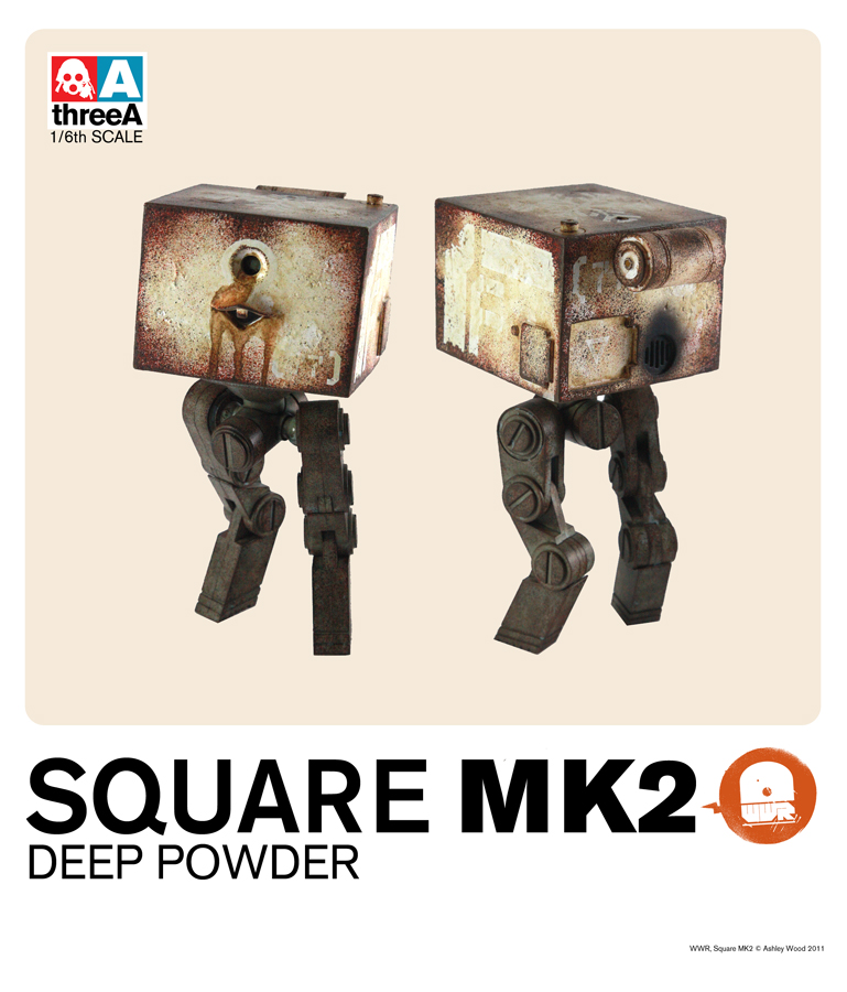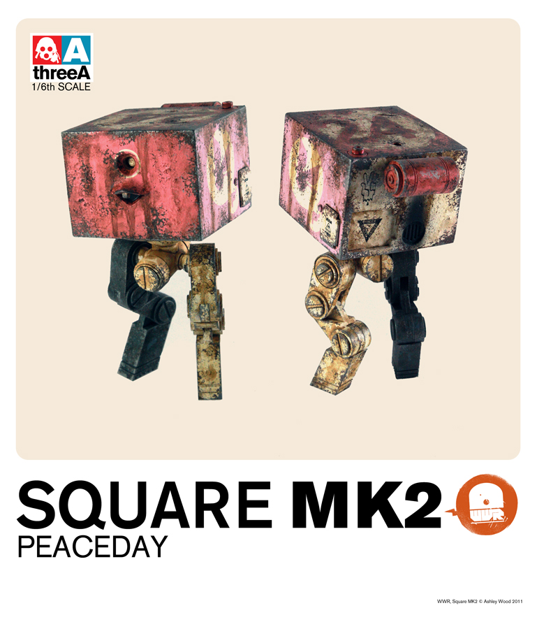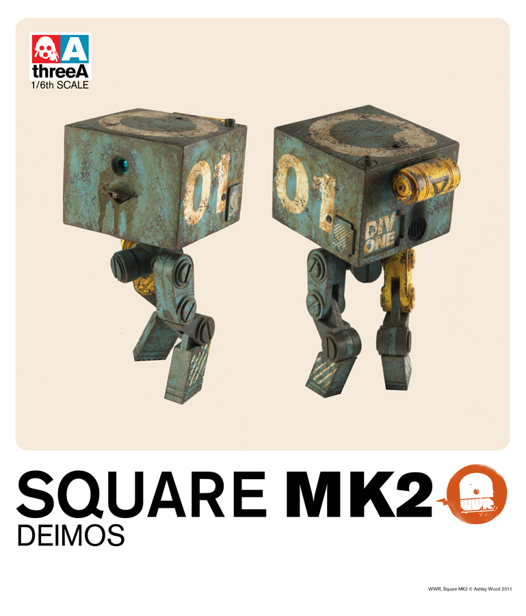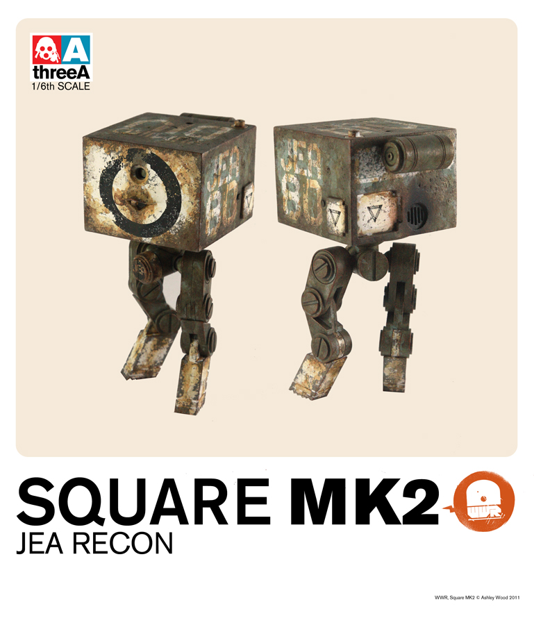 [HR][/HR]3A Toys' line of 1:6th scale Ashely Wood designed robots - World War Robot - expands with the latest incarnation of the Square, the MK2. The Square MK2 differs from its smaller cousin with the addition of much longer legs for running, jumping and kicking. It's two eyes have also been replaced with that of one.