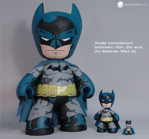 [HR][/HR]Mezco presents the new Mega-Scale Batman Mez-Itz. This 300% Batman Mez-Itz measures 20 inches from the tip of his bat ears to the soles of his bat boots. He also features a real cloth black cape. Just like the standard 2" Mez-Itz, he features 5 points of articulation.