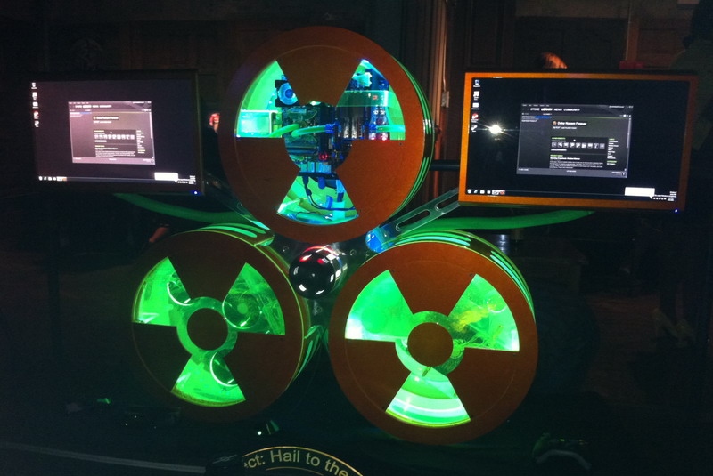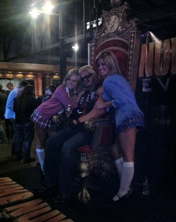 We ventured to the back of the club and found a total of 6 PCs with the game running on 3D enabled monitors. There was an awesome custom gaming rig (pictured above) which had the Xbox 360 version running at full speed. I got to the play the game for about 10 minutes ending in, I must say, an epic boss battle. As I turned around to talk to my buddy about the game I noticed that the Duke’s throne was occupied by none other than the Duke himself and joined by the lovely Holsom twins (top)!