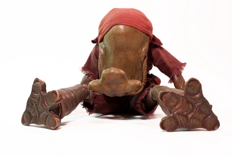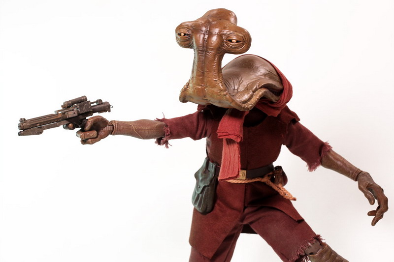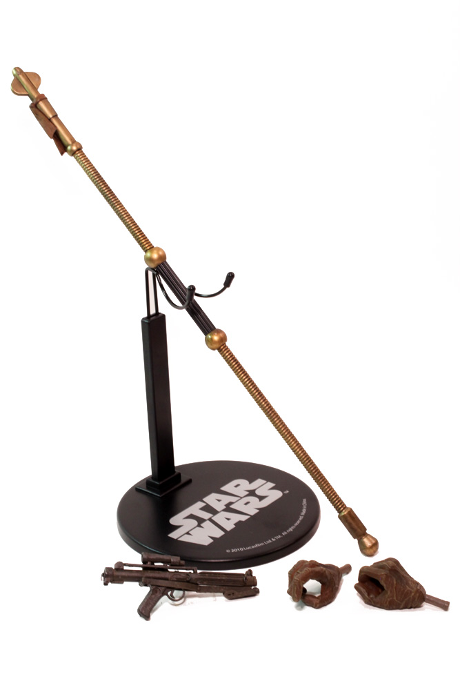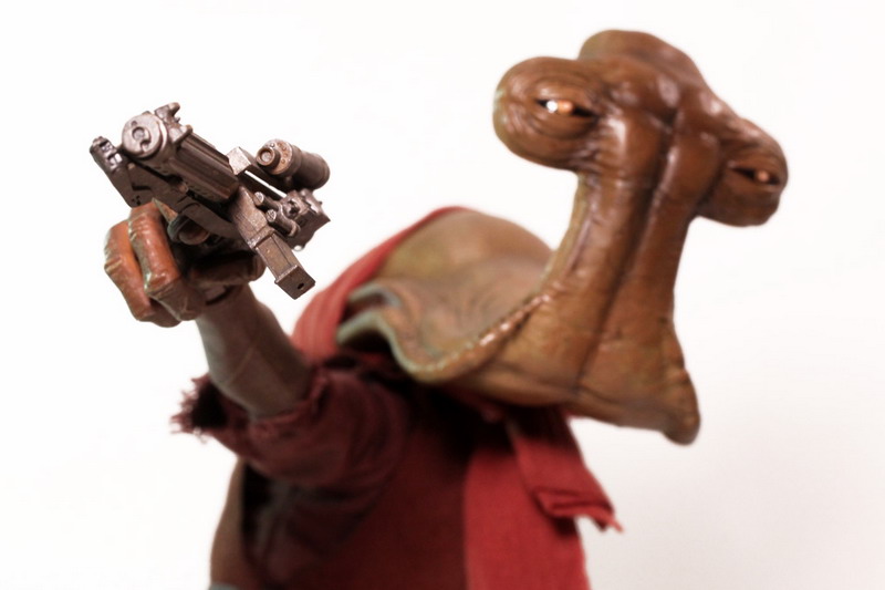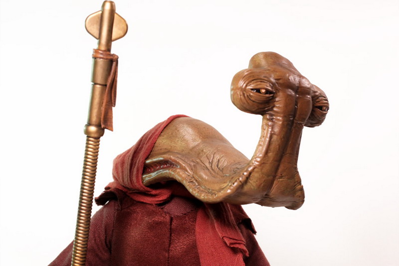 Momaw Nadon’s outfit is a detailed bodysuit, tunic, and scarf which includes a rope belt as well as a regular belt complete with herb pouch and bread bag. The goodies on his belt are just for show and don’t actually contain anything. Momaw Nadon also comes equipped with a E-11 Stormtrooper Blaster, and Display Base with Star Wars Logo. The display stand follows the Hot Toys model of cupping the figure underneath the unmentionables rather than grasping around the waist, a better direction in my opinion. There’s also two additional right hands, one great with the blaster, the other great with the staff. Now, if you’ve picked up the standard issue Hammerhead, you don’t get the Ithorian staff.