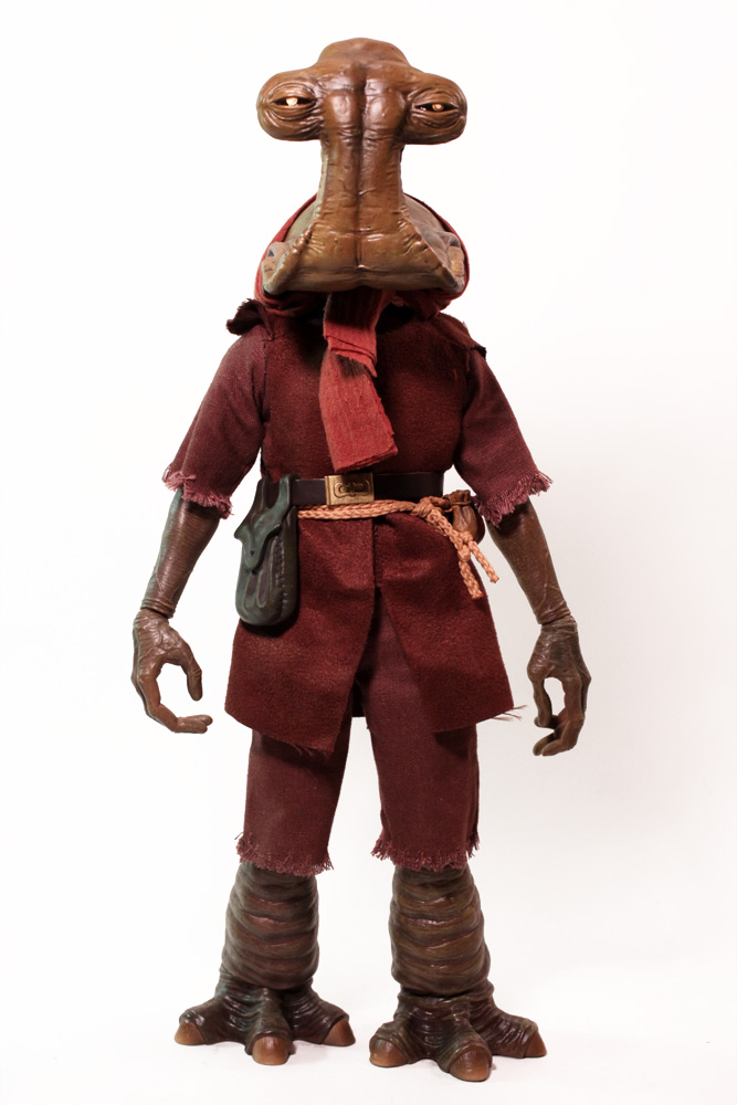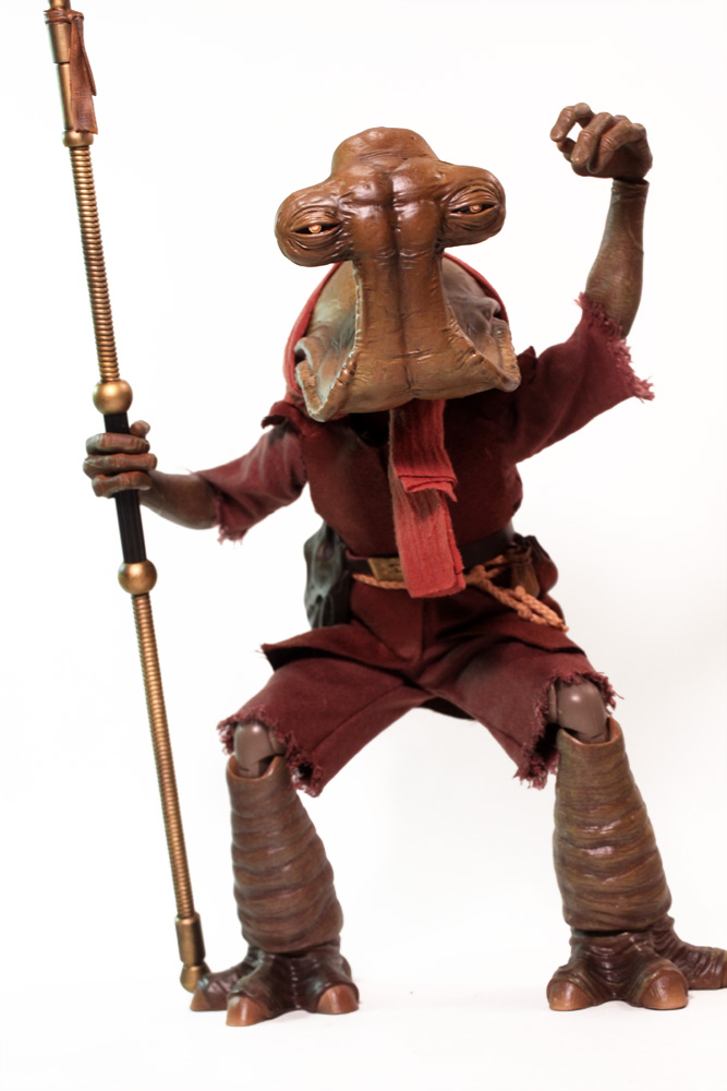 Momaw Nadon, part of Sideshow’s 12” Star Wars collection, is an Ithorian alien and available right now at Sideshow’s website. The standard release is on the Wait List but you can still get the exclusive (reviewed here) for $124.99 (CLICK HERE to order). Limited to only 850 units, the exclusive version comes with an Ithorian Staff accessory unavailable anywhere else.