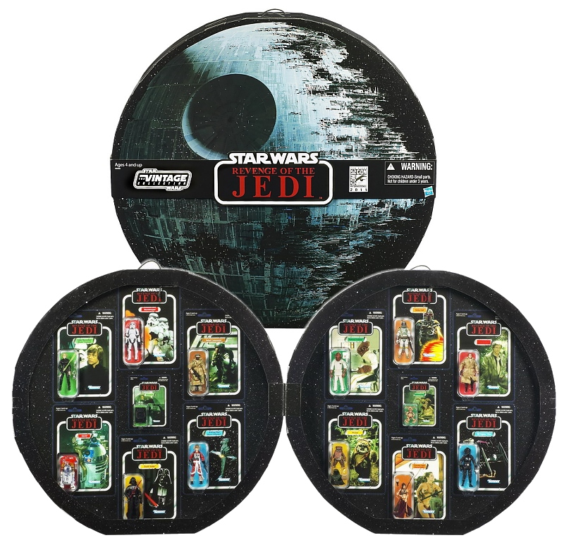 [HR][/HR]As reported to you way back with our Toy Fair coverage, Hasbro will be offering a HUGE Star Wars San Diego Comic-Con 2011 exclusive this year: the "Revenge of the Jedi" Collector's Set. Packed in a gigantic cardboard case that resembles the Death Star II, this set holds 14 individually carded Vintage Collection figures featuring the "Revenge of the Jedi" logo on the packaging to commemorate the preliminary title of the film before it was changed to Return of the Jedi. Included are two of the smallest carded figures Hasbro has released: Salacious Crumb and a Mouse Droid.