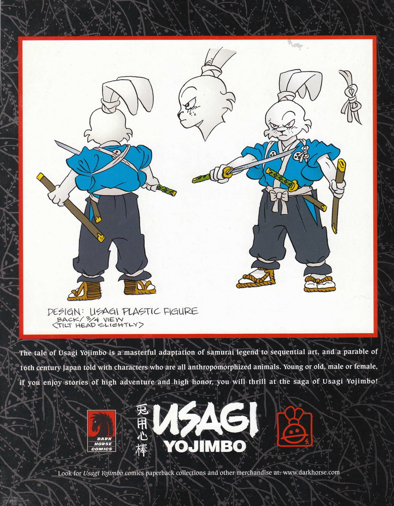 [HR][/HR]Stan Sakai's ronin rabbit Usagi Yojimbo has only had a few figures produced in his image, most notably his inclusion in the vintage Teenage Mutant Ninja Turtles line. However, those looking for the one of the most authentic reproductions should look no further than this masterfully crafted 8-inch vinyl collectible from Dark Horse. While lacking the playful articulation of the TMNT toy, this figure packs an incredible sculpt and cool katana accessory. A must-have for Yojimbo fans or those into wild animal warriors.