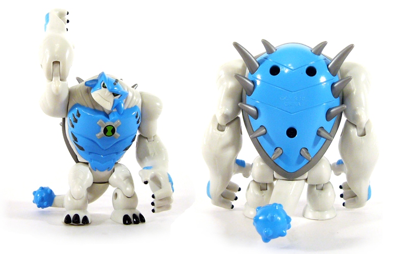 Ultimate Humungousaur is an upgrade from the previous season’s Humungousaur, a dinosaur-like alien with vast strength and the ability to grow to great size. The Ultimate version is even beefier and gains heavy armored plates on its chest, an attached helmet, a spiked turtle-like back shell, and a spiked ball on the end of its tail. Ridges on the back of its hands can transform into projectile launchers for bad guys at a distance. The Ultimate Humungousaur action figure faithfully replicates this look with a huge torso, long arms, and relatively tiny legs. It has good articulation with joints at the neck, shoulders, elbows, hips, knees, and tail.