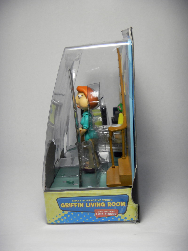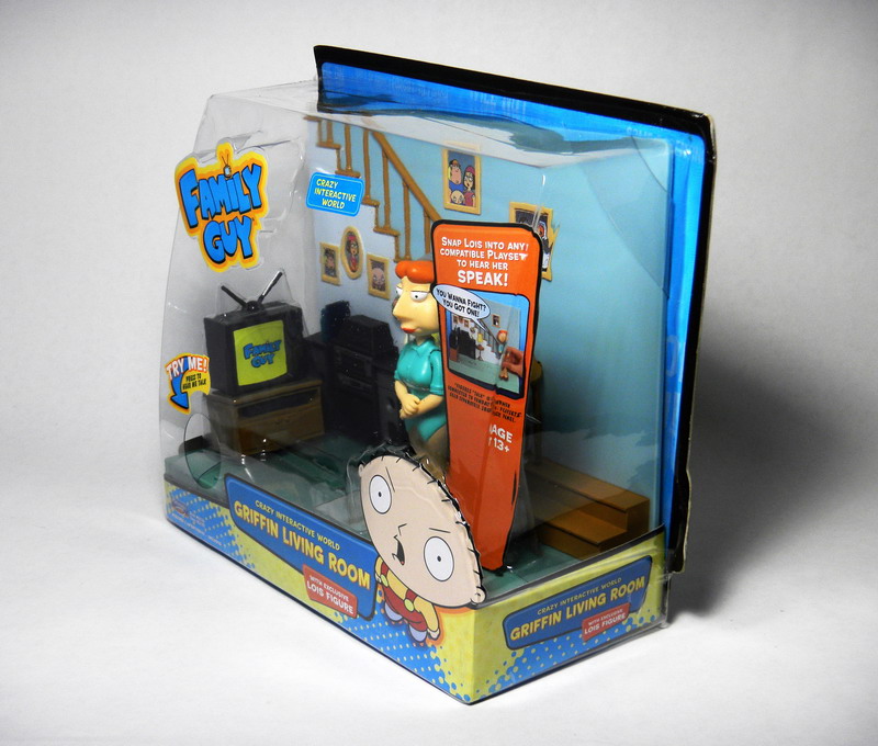 This awesome new action figure line will kick off with the release of with the release of the Family Guy Crazy Interactive Griffin Family Living Room play set which includes an exclusive Lois action figure. This will be the first of several interactive environments Playmates has planned to release and will interact with each individual Family Guy figure when placed on any of its two magnetic ports. Just as with Playmates' Simpsons toy line, each figure will feature a unique sound chip which actives a series of distinctive phrases when placed on the "Crazy Interactive" environments.