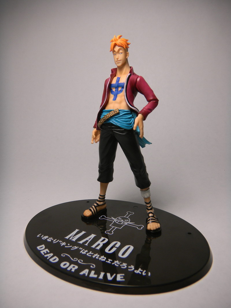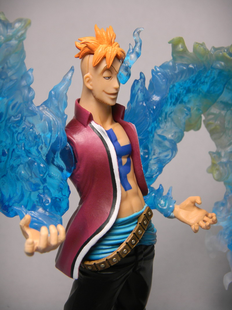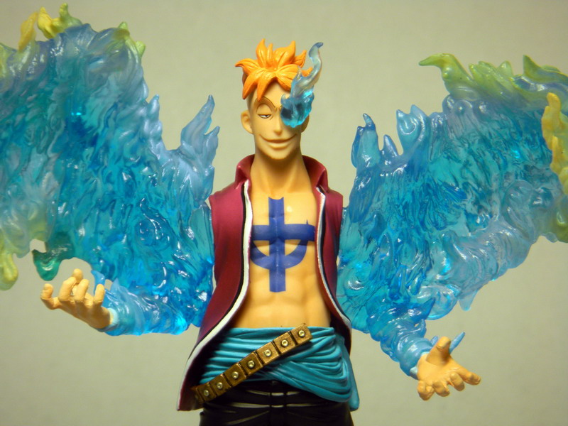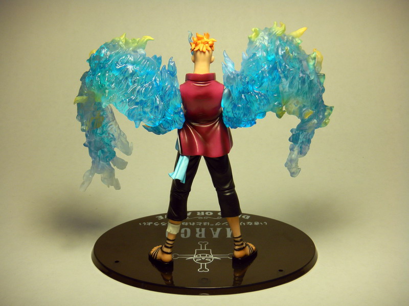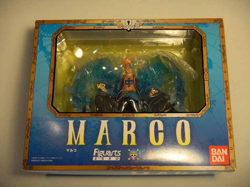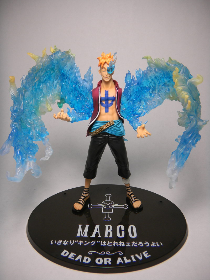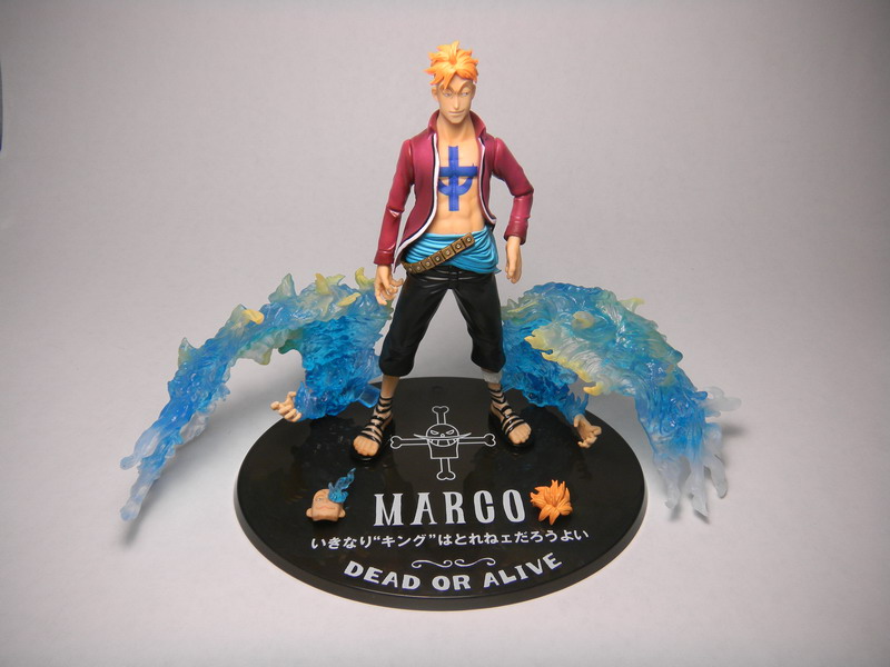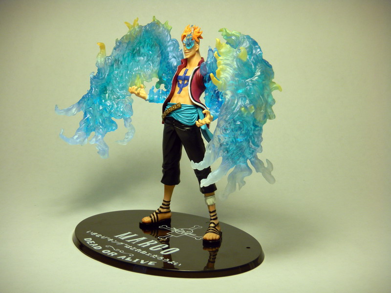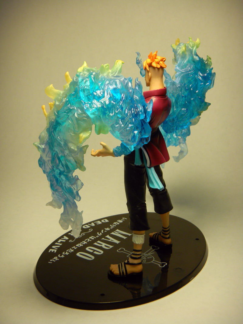 The character that stands out significantly among the latest Figuarts Zero releases is Marco. This distinctivelly different pirate comes with 2 pairs of interchangeable arms allowing collectors to dispaly him wielding his blue flames as he descends into phoenix form. For those who are not familiar with the character, you would immediately assume that Marco has the power to control water as the sculpt and overall look seem to indicate but they are infact arms engulfed in blue flames taking the shape of wings and it looks amazing. The figure also includes a second set of standard arms providing a set of display variations on the figure. Marco includes a display stand with name and One Piece logo as well as two clear plastic holders to prop his heavy powered-up arms up and keep them from falling off the torso because of their heaviness.