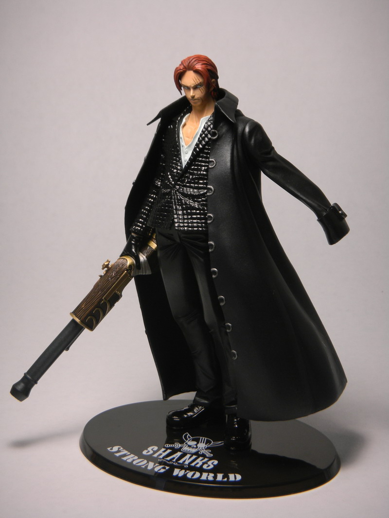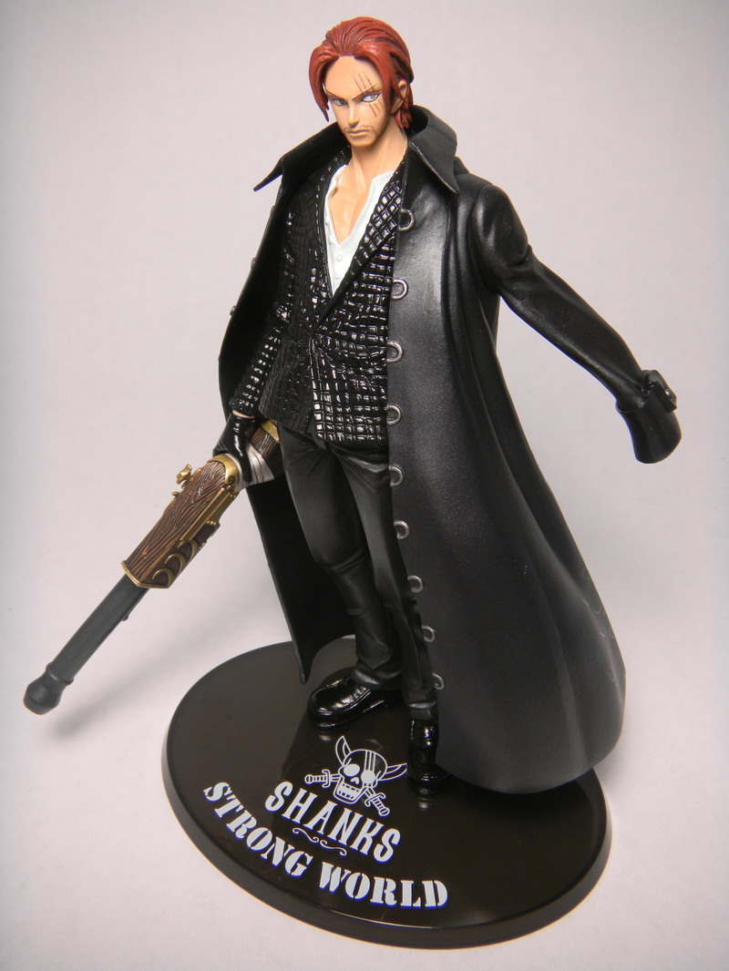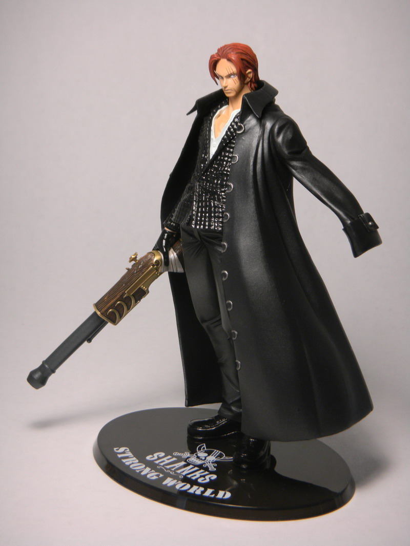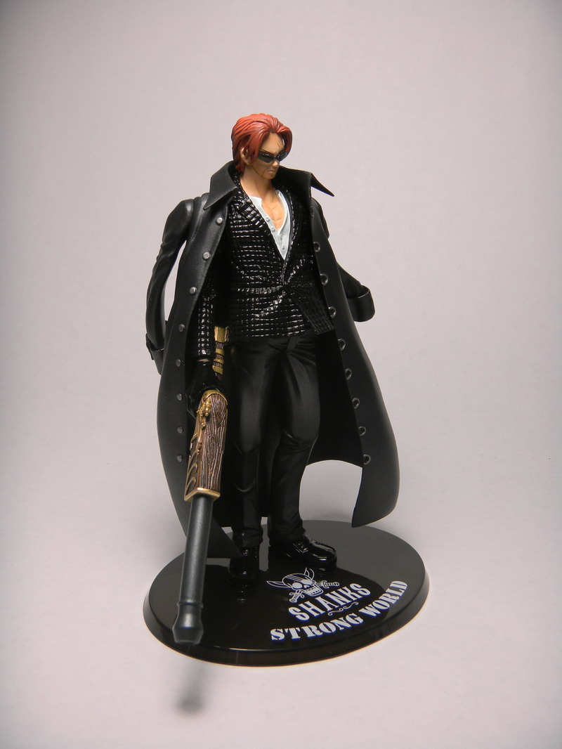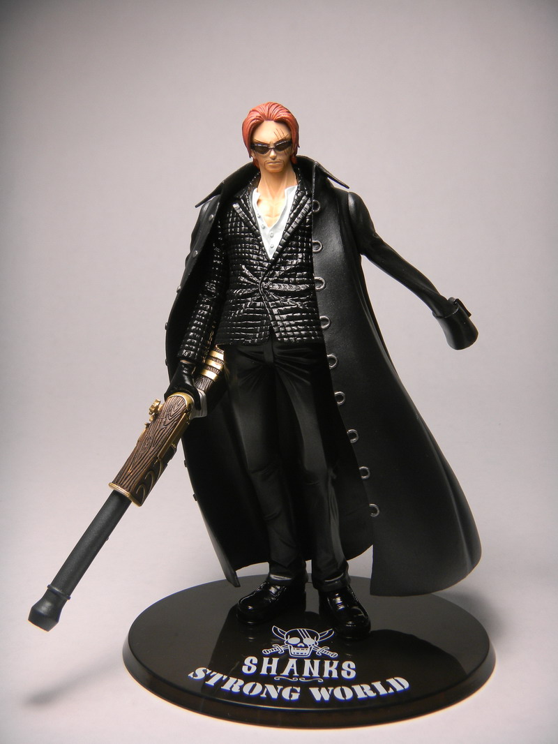 The new Strong World version of shanks depicts the familiar one-armed pirate wearing an all black outfit which consists of a black leather trenchcoat and holding an oversized rifle. Shanks also includes an additional interchangeable head wearing sunglasses. This version of Shanks depicts the character in a darker more sinister light as his look is drastically different from his usaul appearance in the anime. The sculpted details on shanks while very well executed share the same pose as the previous version of Shanks but the all balck outfit and gun make it a bit harder to familiarize with its previous figural incarnation.