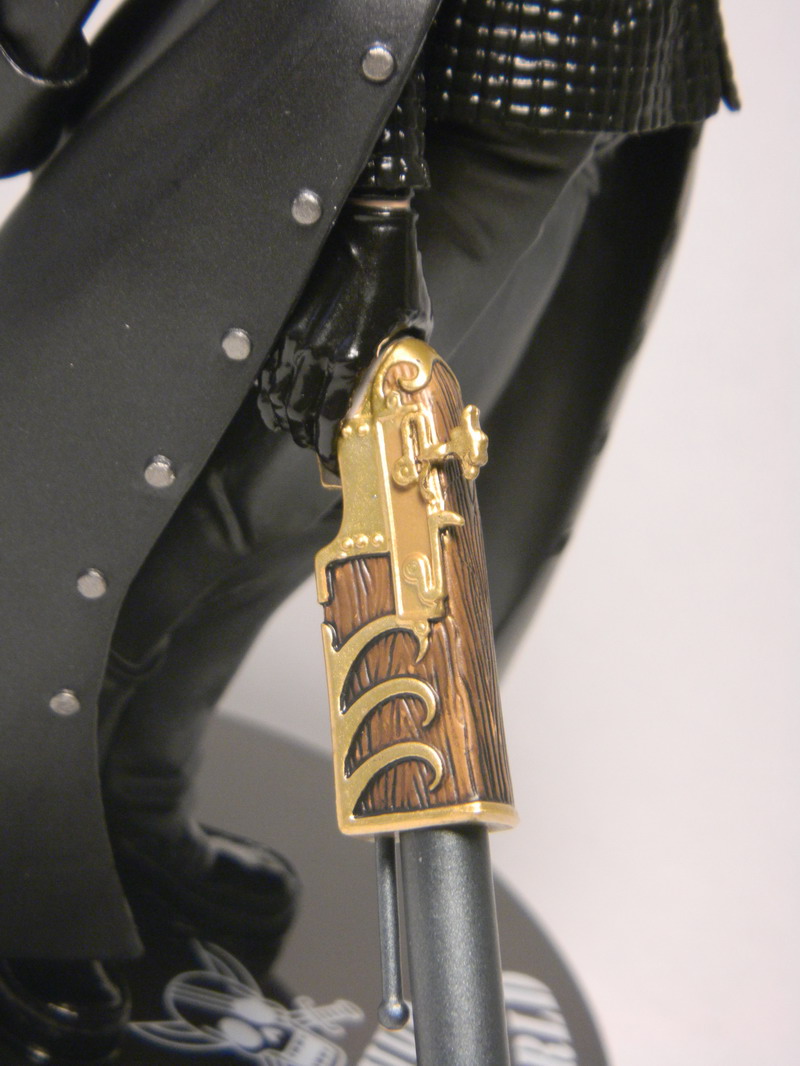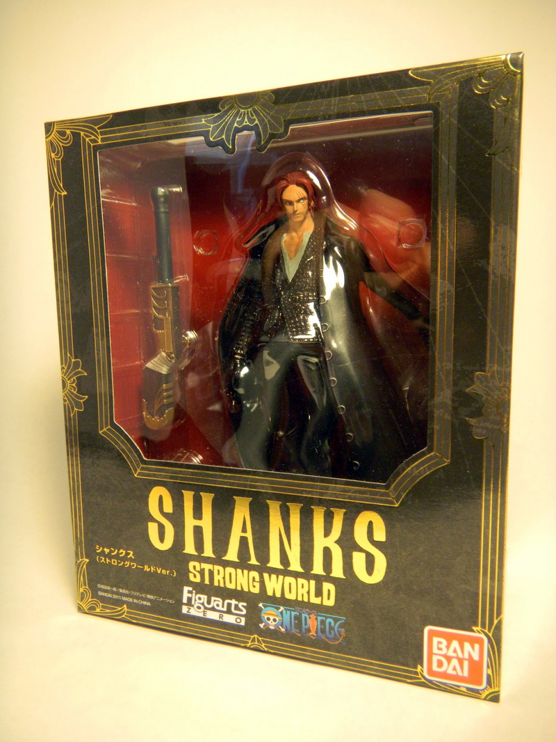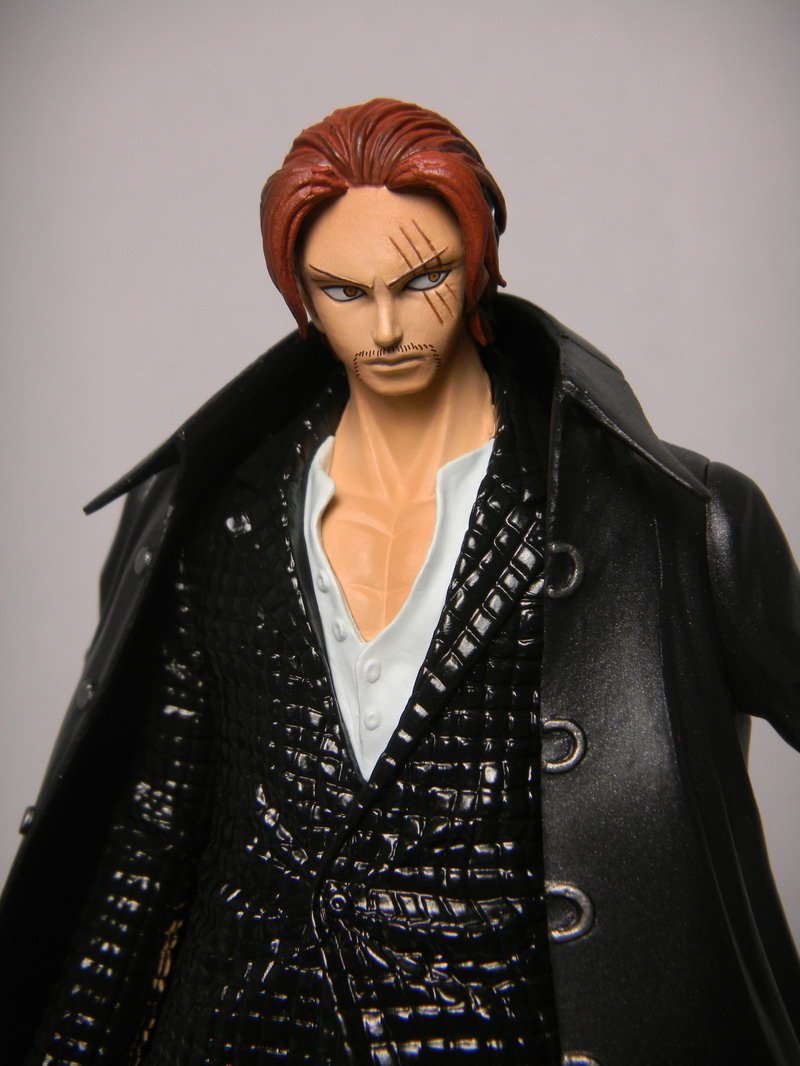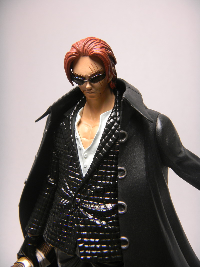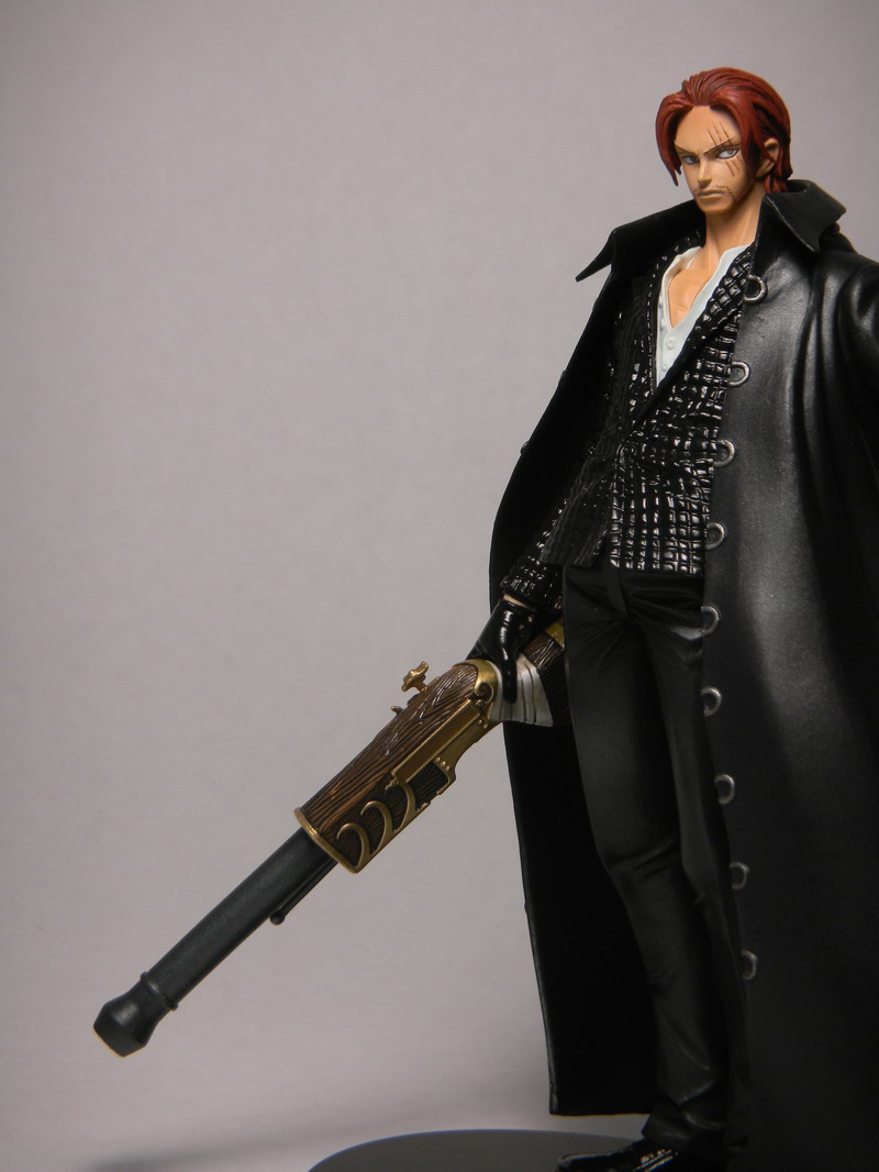The new Strong World version of shanks depicts the familiar one-armed pirate wearing an all black outfit which consists of a black leather trenchcoat and holding an oversized rifle. Shanks also includes an additional interchangeable head wearing sunglasses. This version of Shanks depicts the character in a darker more sinister light as his look is drastically different from his usaul appearance in the anime. The sculpted details on shanks while very well executed share the same pose as the previous version of Shanks but the all balck outfit and gun make it a bit harder to familiarize with its previous figural incarnation.