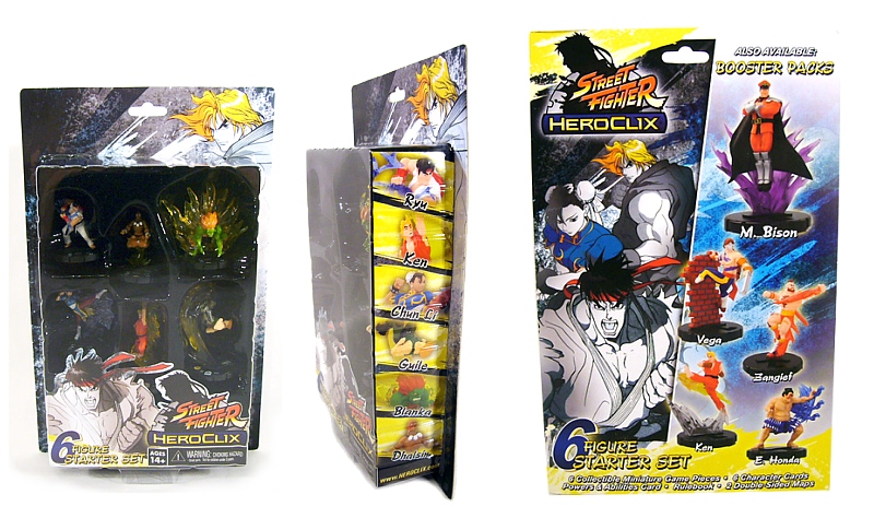 Starter Sets have everything you need to start playing HeroClix immediately. The Street Fighter version comes packaged in a slick bubble/card that shows off the six figure of the set amidst plenty of dynamic artwork. The figures are listed on an insert in the left side of the bubble, and the bottom of the back panel lists all of the contents that you can’t see (rulebook, cards, etc.). The back of the card also shows some of the great figures available in the gravity feed booster packs like M. Bison, Vega, and Zangief.