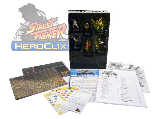 The Street Fighter component of HeroClix includes two new releases that will be in your local comic book and games stores today (8-10): the Starter Set and the Gravity Feed. Each year WizKids puts out one HeroClix Starter Set which is the perfect jumping off point for new players, and also a great resource for existing ones. Meanwhile, the gravity feed is a new distribution model for smaller sets with single figure blind boosters; this has been very popular with Green Lantern and Captain America sets thus far and will continue with Gears of War and more. Let’s take a closer look at each one!
