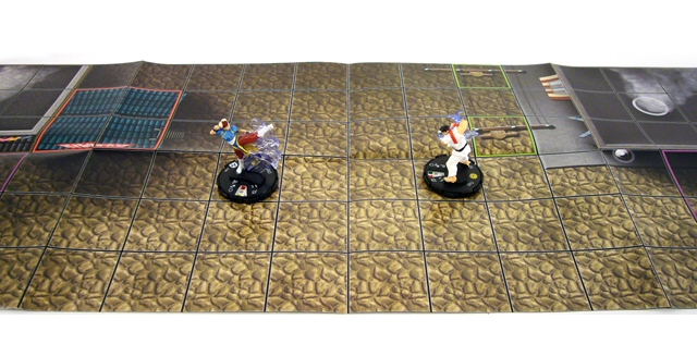 The Starter also includes the new and improved 2011 HeroClix rulebook (good for the entire game as well as Street Fighter) and the similarly updated Powers and Abilities Card that outlines and defines every single standard power and ability that appears on the figures’ dials. See a red square around Chun-Li’s movement number? Go to the PAC to find out what Flurry does! As mentioned above, there’s also a sheet with one-on-one format rules offering new ways of playing with your friends. These will work with most HeroClix figures from any set, but are particularly well suited to Street Fighter and other single booster expansions. Finally, the Starter Set has two new double-sided maps that recreate combat areas from the games!