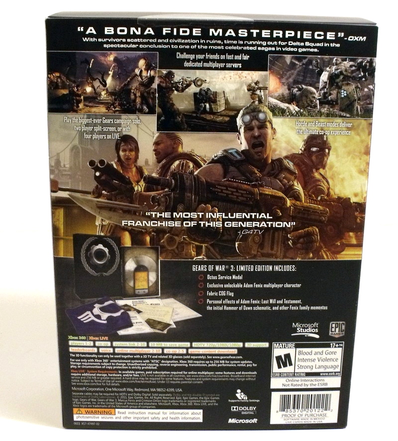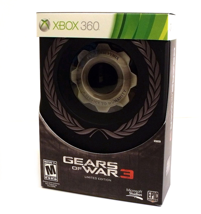 [HR][/HR]Happy Gears of War Day! Today millions of passionate Gearheads celebrate the release of the third (and final chapter) in the Gears of War video game series with not one, but TWO collectible versions of the title. For $80, fans can pick up the Gears of War 3 Limited Edition. In addition to a $60 copy of the game, fans get an Octus Award Service Medal and display box, fabric COG flag, and the Personal Effects of Adam Fenix. For the uber hardcore, there's the Gears of War 3 Elite Edition ($149.99) which includes all the goodies in the Limited Edition, plus an art book and collectible Marcus Fenix statue from TriForce (read all about the statue HERE).