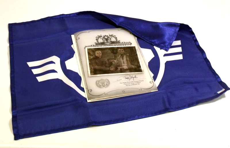 Unfurling the flag reveals yet more GOW goodness: the Personal Effects of Adam Fenix. I haven't read these yet, but Epic did a nice job on making the paper replicas look weathered and authentic. Good paper stock too (though the Octus Medal certificate is made of clear plastic).