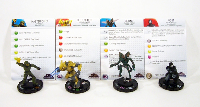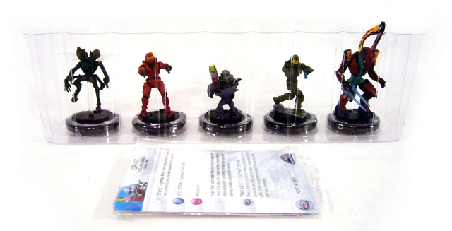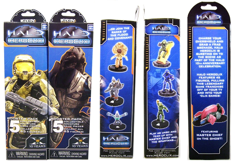 Like the major DC and Marvel HeroClix expansions, Halo comes to you in a full 45 figure set packaged in blind booster boxes with five characters apiece. The boosters come in two art styles with the front panel showing either a Master Chief or Elite (they’re otherwise identical). The boxes give you some details about the set and show off some of the figures including a Spartan, two Master Chiefs, some Covenant, Flood, and the amazing chase Master Chief on Ghost figure.