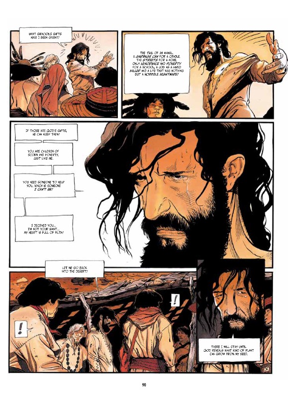 Besides Juan, Jorodowsky's creates an impressive cast of characters who each play an important role in the rise and fall of Juan as both a sinner and a saint. Most important are Boss, the corrupt politician who hires Juan to be the bodyguard for his wife and son; the Boss' wife and son Lucho, who seek solace and care from Juan and find nothing but heartache and regret; and Boss' bodyguards Elder, Jackal, Bigmouth, Blondie, Pinocchio, The Greek, and Fairy. Their names are perfect for them and fit them well. These bodyguards fight for leadership (p. 65 & 66, above) and thus it's no surprise Juan becomes even stronger and even violent as he joins this crew and eventually leads it.
