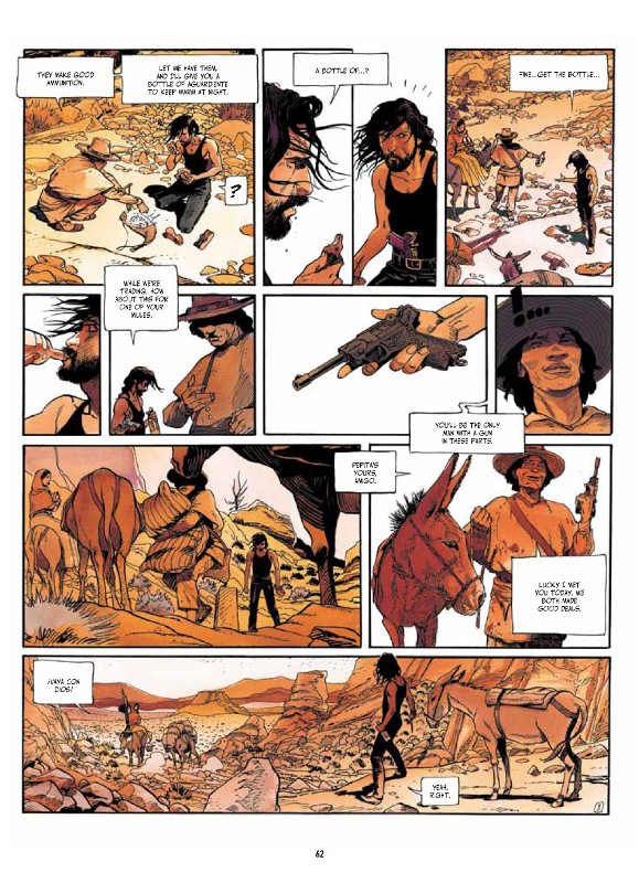 In respect to the artwork, Bess does an outstanding job of bringing to life Jorodowsky's character-driven script. Whether it's the character designs - specifically the Boss' henchmen and wife, whose looks give their personalities meaning, or the scenery, including the dank and dirty slums of the city and the scorching desert (above & below), Bess' artwork captures these all with amazing detail and realistic style. Likewise, the use of panel design helps move the story seamlessly between setting and time, ensuring readers never feel out of touch with the tale of Juan Solo and his violent rise, tragic downfall, and graceful redemption.